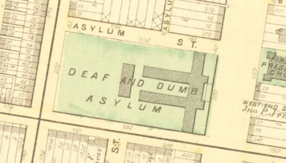 However, an image taken from G.M. Hopkins’ 1875 Philadelphia Atlas shows that the art school was originally an educational institution of a different kind. For its first 70 years, Haviland’s building housed the Pennsylvania Institution for the Deaf and Dumb, alternately known as Philadelphia’s Deaf and Dumb Asylum.