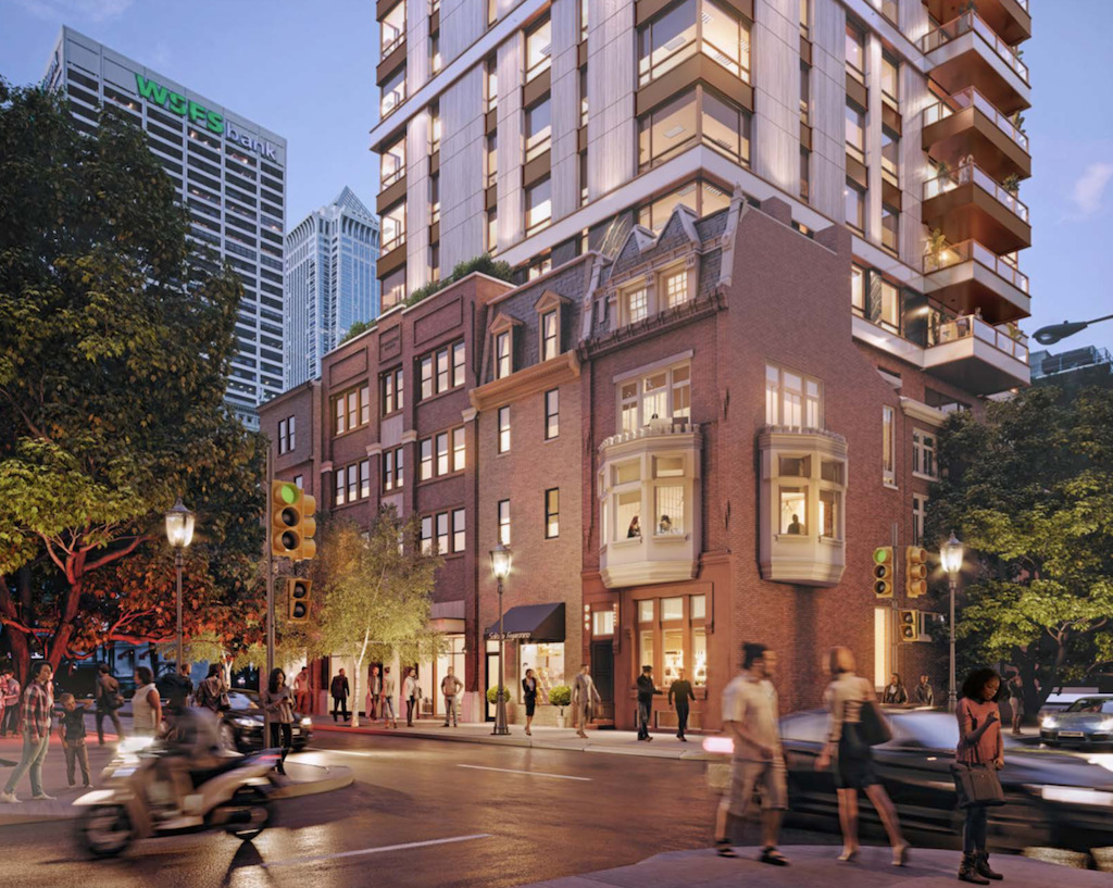 You can see, the buildings at 113-119 S. 19th St. have been demolished, as has a one-story building on Sansom Street which was home for several years to Cavanaugh’s Rittenhouse. We told you to expect something like this in anticipation of a sizable development from Pearl Properties. Incidentally, when we last updated you on the project in 2022, we told you to expect that the buildings on 19th Street would disappear but that their facades would remain. That has not occurred as you can clearly see, and we have to imagine that this was due to some combination of structural and/or economic issues. This means that the renderings that we shared before will change somewhat. But here they are, anyway.