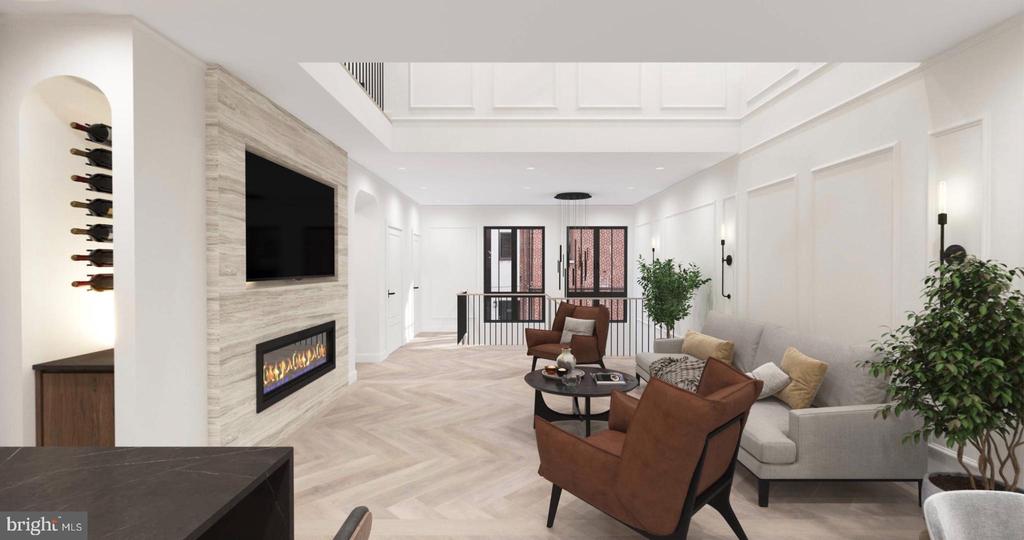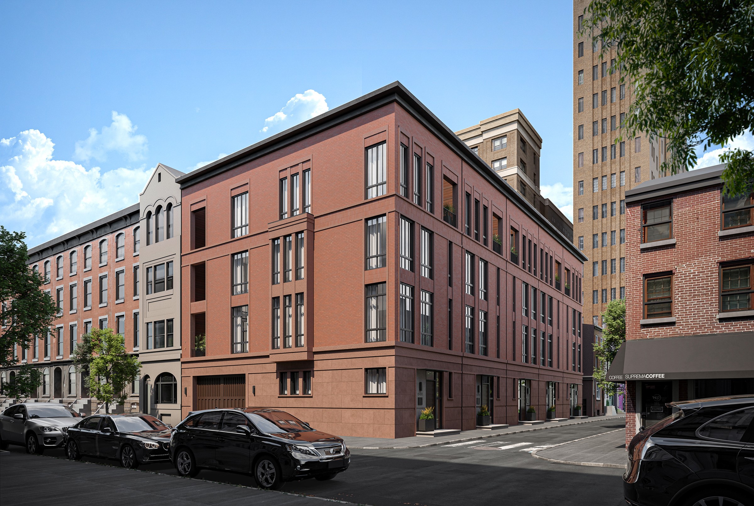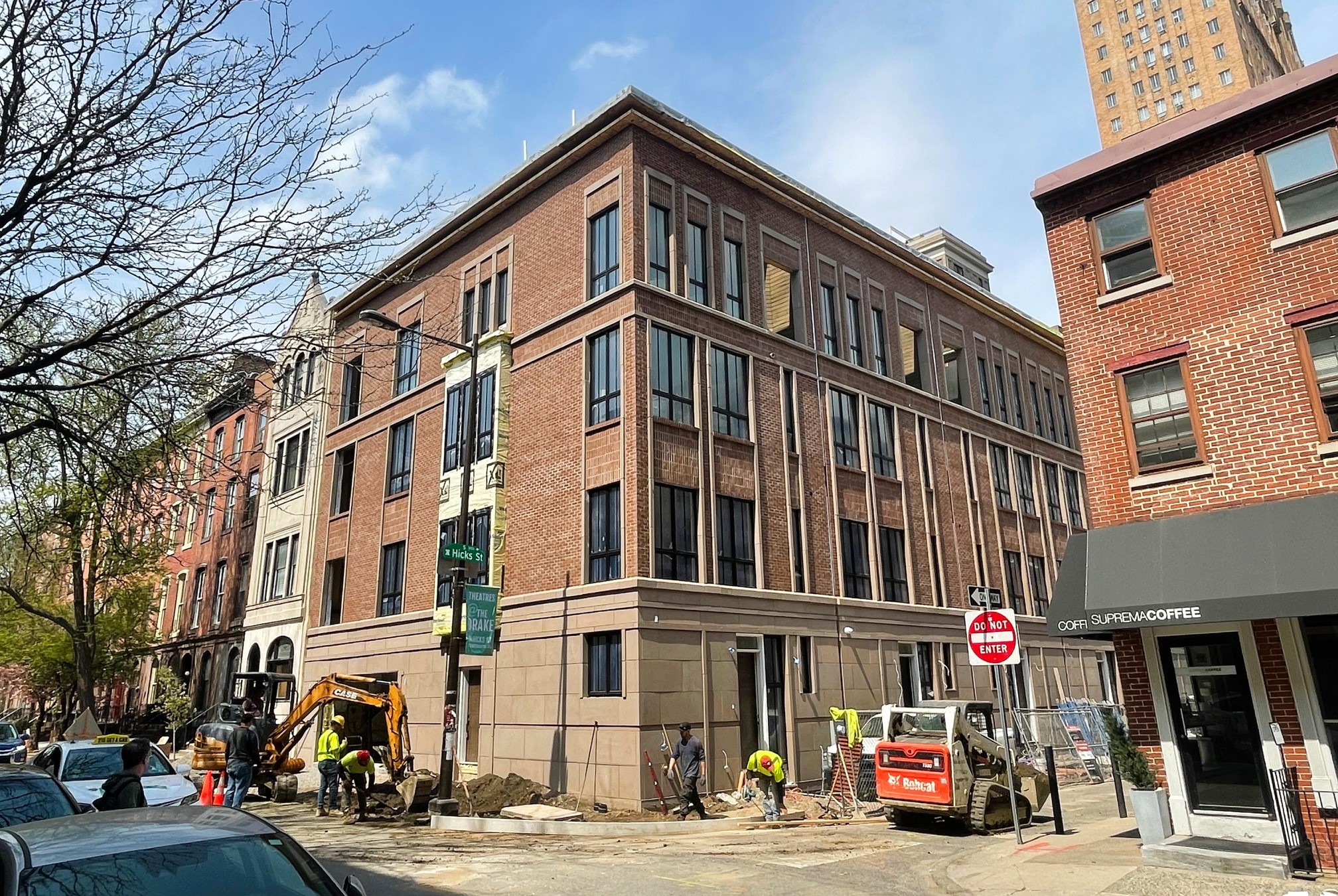 Progress has been moving here, with the exteriors of the homes looking almost complete – with brand-new sidewalks and curbs going in when we visited. These are sizable houses, each with two-car garages accessed from a shared curb-cut along Pine. Each of the five homes feature four bedrooms, four full/two half bathrooms, elevators, and multiple outdoor spaces, bringing several urban mansions to the area. Stone makes up the first floor, with brick on the upper floors, including some pretty nifty fluted patterns to offer a dash of modern panache. Let’s scope out Bowery Place, named for the dense, tiny street that stood on site before the parking lot.