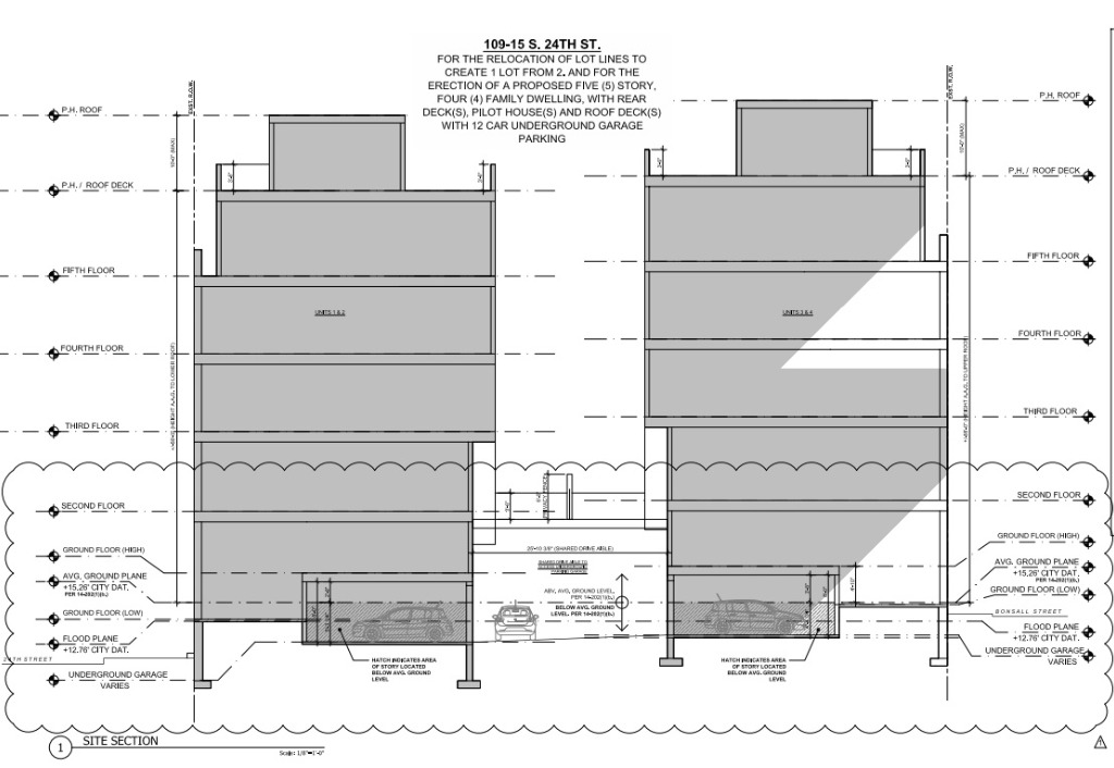 Extrava at Fitler Square, as these homes are called, is a four townhouse development from Zatos Investments. Gnome Architects is handling the design work, and we are very happy to see that they have yet another good-looking design to add to their recent work. These homes are going to be massive at 28 feet wide, almost double the typical Philly rowhouse width. This will allow for 3-car garages accessible via a drive aisle on Ionic Street, per zoning documents. Each unit will have over 5,300 sqft of living space and will feature four bedrooms, 4.5 bathrooms, elevators, and decks with built-in grills and hot tubs. Sounds like a place we could manage living in if we had to.