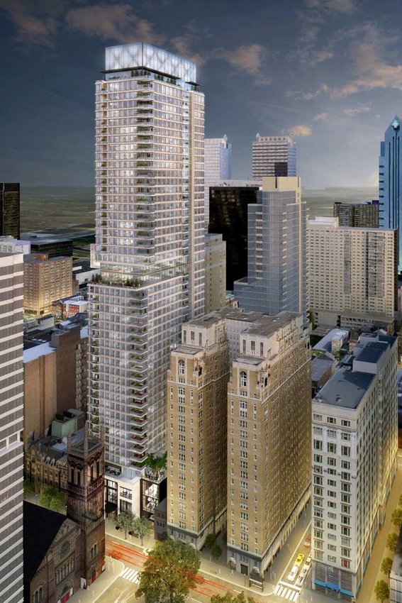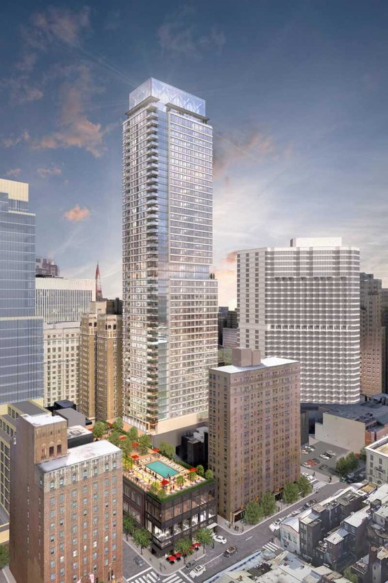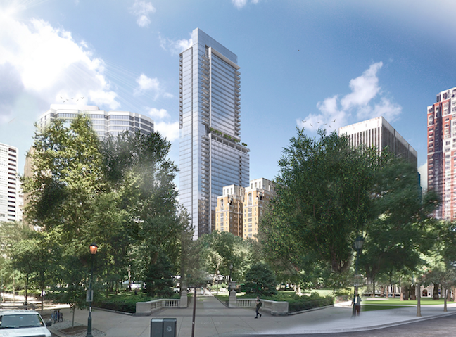 As for the details of the building, the height will shrink down to 47 stories and there will be a max of 335 residential units with a mix of condos and rentals. Plans for Sansom Street will change dramatically, with the preservation of two of the historic buildings on the block. Those properties, the Rittenhouse Coffee Shop and the Warwick, will be used by Project HOME for 35 units of supportive housing, which will add an unexpected bit of economic diversity to the project. Part of the facade of the Oliver Bair funeral home, another historic building on the block, should be reused as part of a terrace on the third floor.