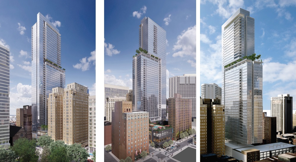 Some of those plans have been close to becoming a reality, but we're pretty sure none have come as close as the current proposal from Southern Land Company. We told you about this project at the beginning of the year when the details of the project were still up in the air. Back then, we showed you an image of the massing of three buildings with a small building on Walnut Street and two huge buildings on Sansom Street. Now, thanks to Skyscraperpage, we see that a totally different plan is now in the works. The developers are cooking up a plan for a 51 floor, 600' building that would include a mix of rental apartments, condos, and retail. Solomon Cordwell Buenz did the design work.