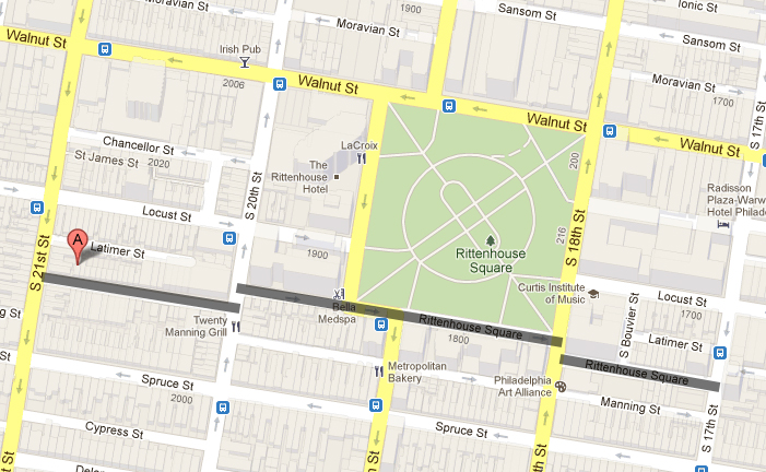 Though Rittenhouse Square Park is only a block and a half wide, the street “Rittenhouse Square” runs all the way from 17th Street to 21st Street (and also, strangely, between 22nd and 23rd Streets).