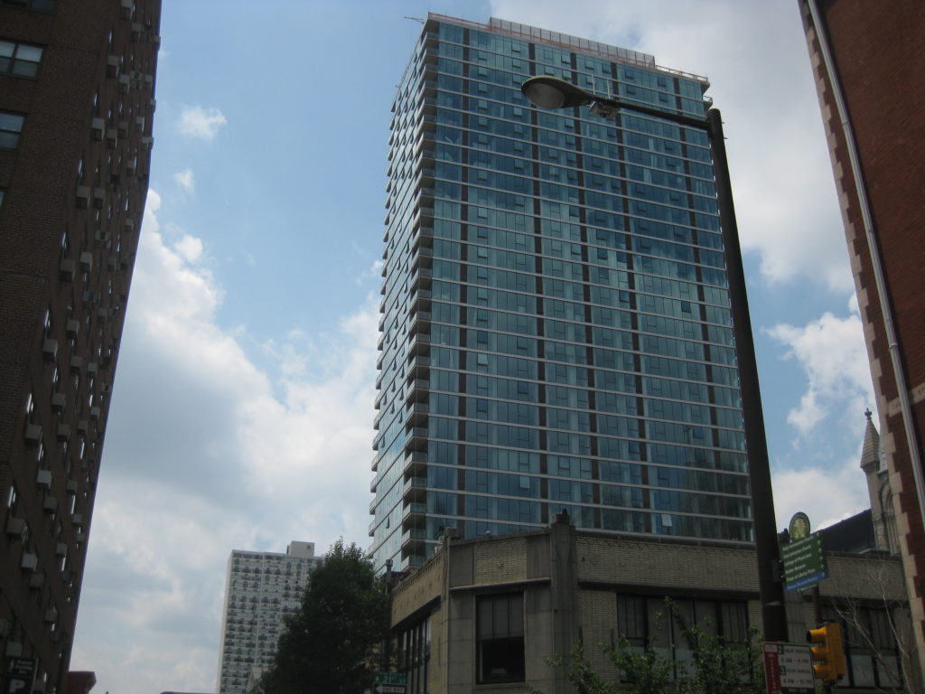Last summer, when we last checked in on 2116 Chestnut Street, the new building had grown to about ten stories. Over the last year or so, the 34-story building that replaced the modernist Sidney Hillman Medical Center has grown to full size, with the building now fully enclosed by shiny glass.
