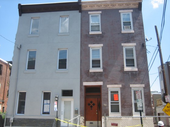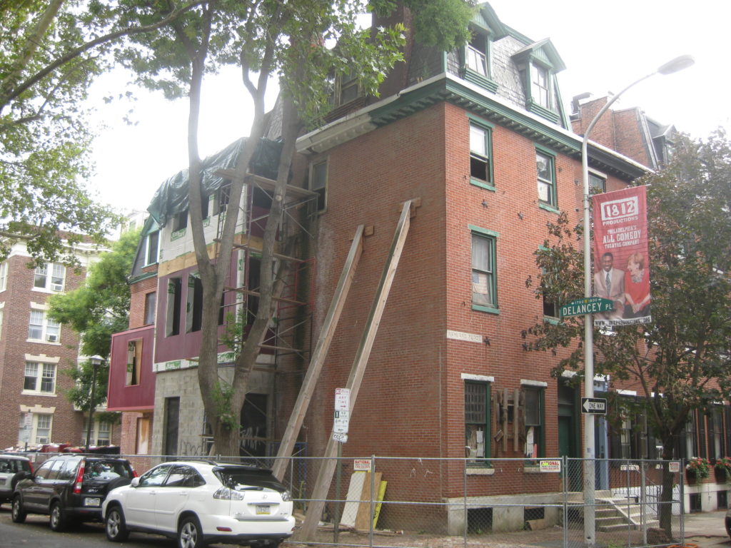 We checked the handy dandy new L&I website, and discovered that three building permits have been pulled in the past few months, with plans for major interior alterations as well as exterior alterations that have to be approved by the Historical Commission. Would the Historical Commission approve the red siding for the bays? On the plus side, it appears as though an engineer is being consulted- we’re not entirely confident that this building is structurally sound at this point. And as an aside, how is it fair that someone who owes nearly $40K in property taxes should be allowed to pull permits to alter their property?