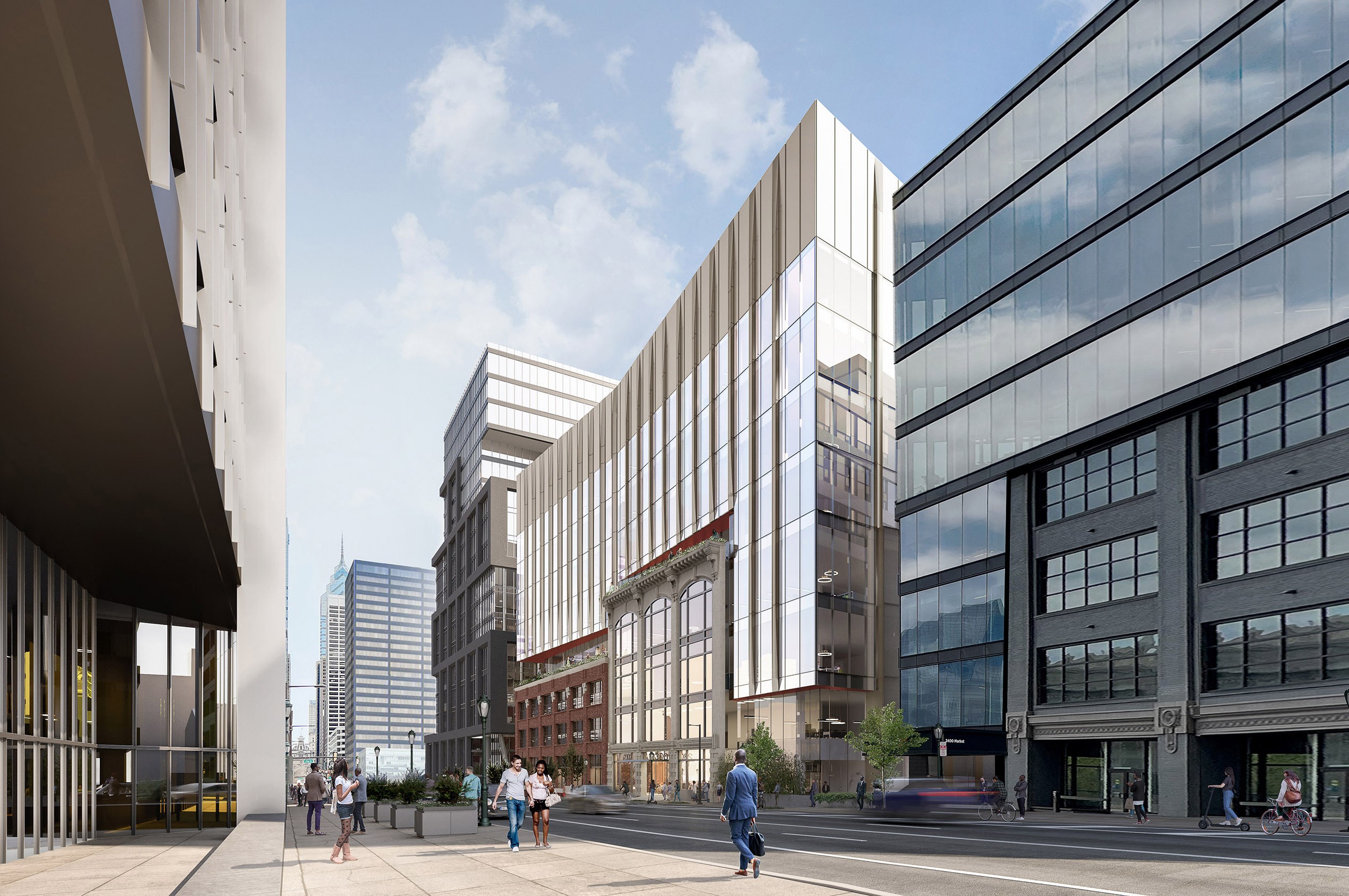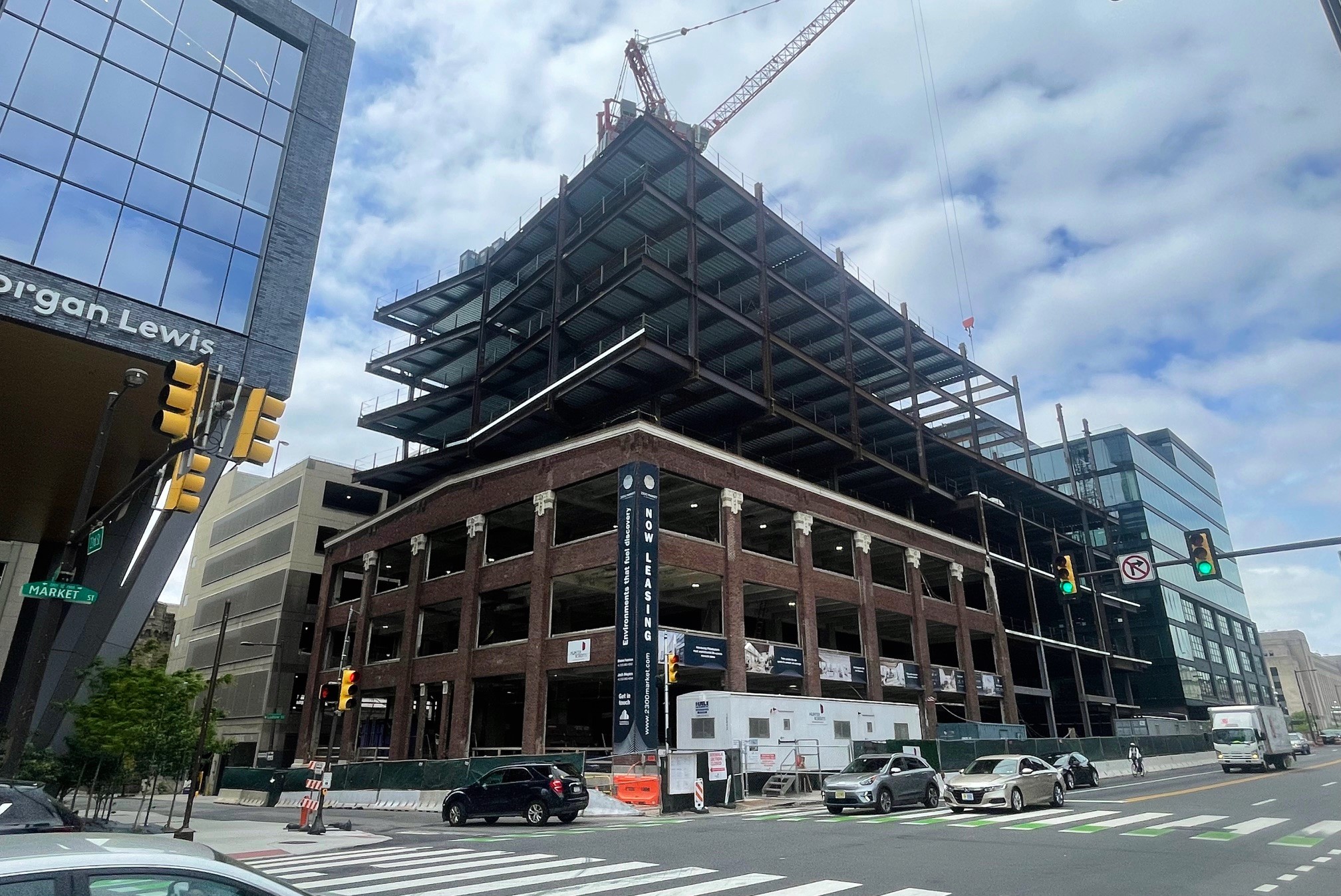 It wasn’t that long ago when the western part of Market Street in Center City was, shall we say, in need of some love. Formerly home to adult movie theaters, parking lots, and a handful of underutilized buildings, the area around the massive PECO parking lot wasn’t exactly a destination. But, as we anticipated earlier this year after demolition started last year, this area is now looking completely different, with 2300 Market St. filling the gap between its shiny new neighbors.