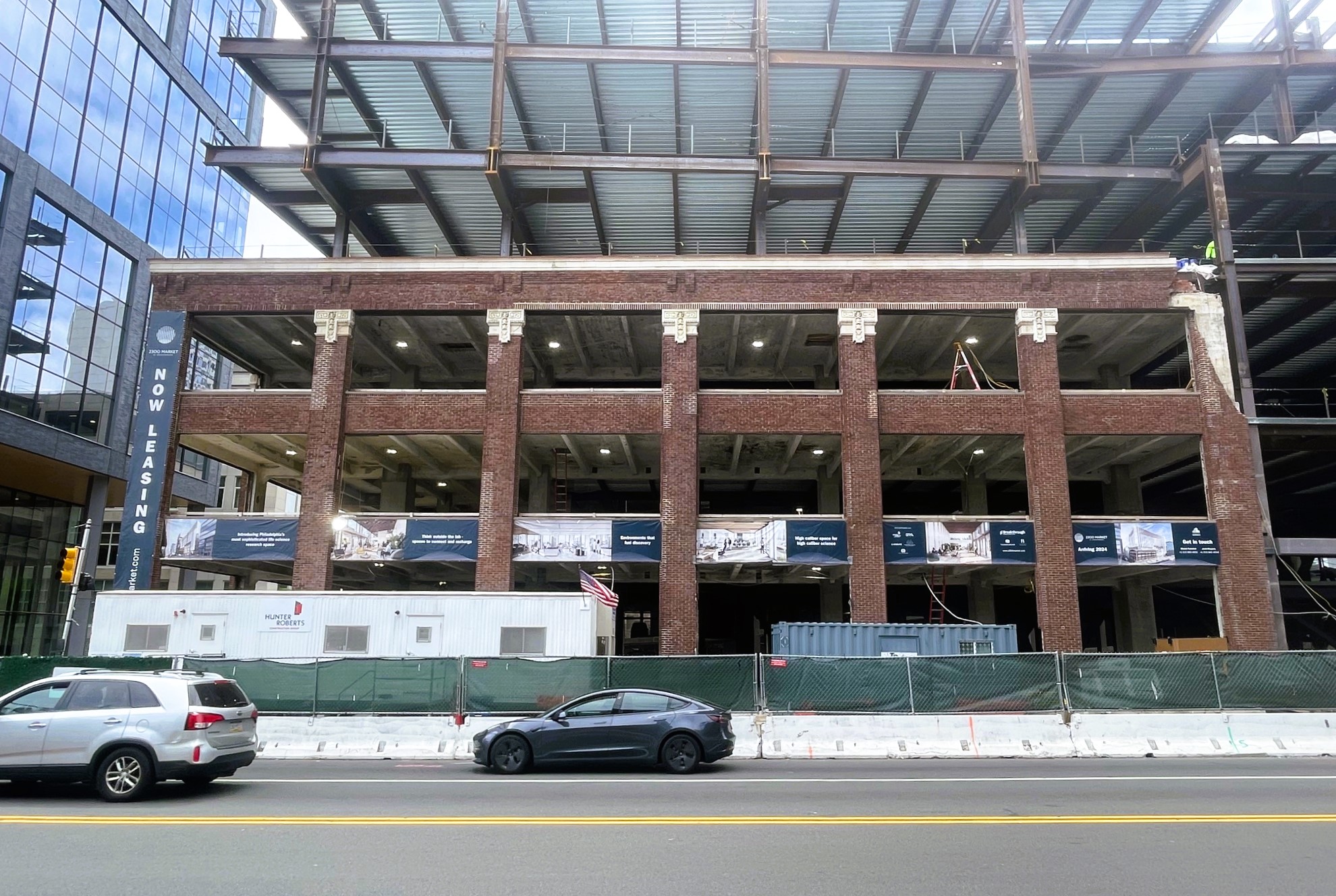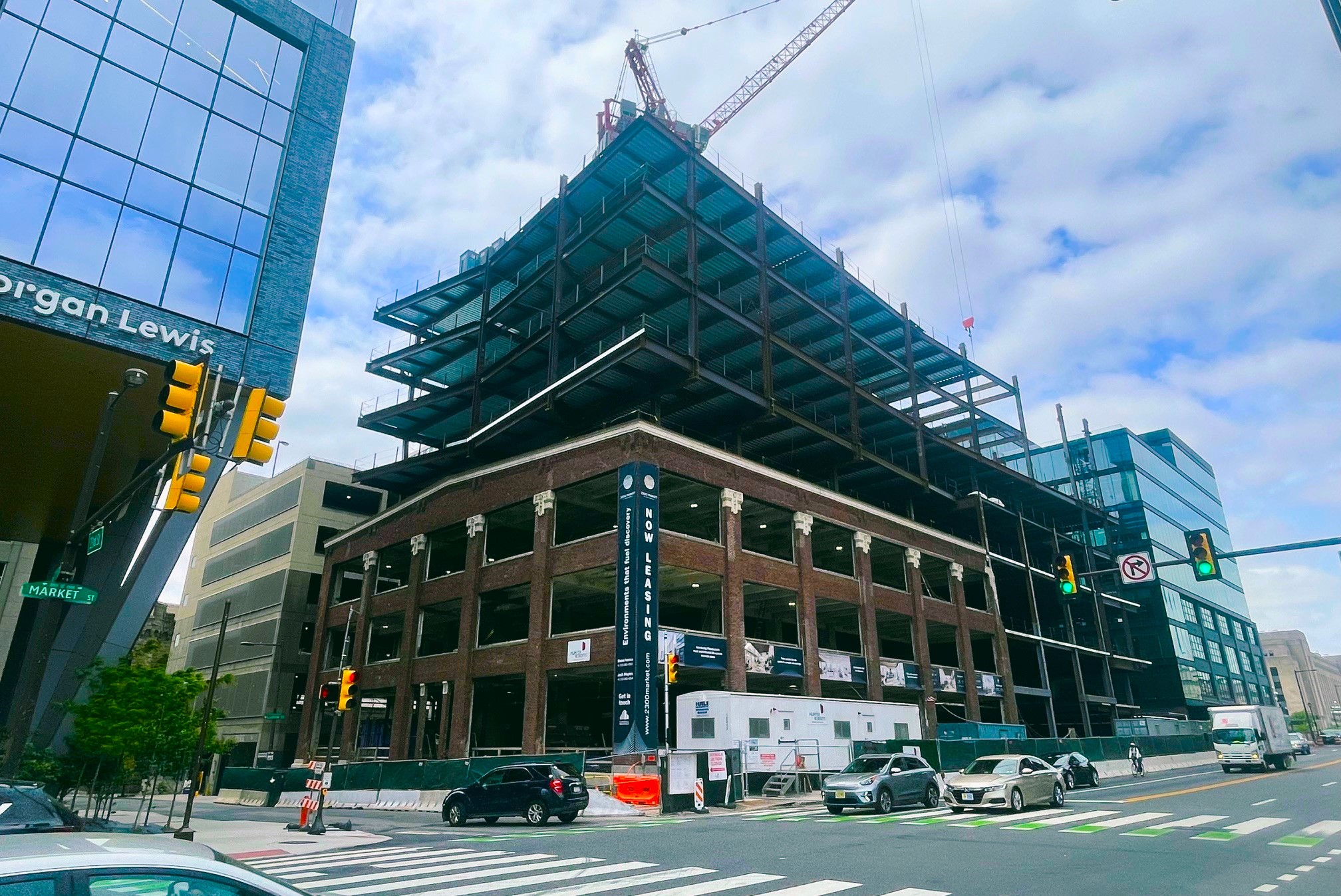 What you see under construction is a brand-new lab space, developed by Breakthrough Properties (a partnership between Tishman Speyer and Bellco Capital). This project, rising between the headquarters for both Aramark and Morgan Lewis, will see eight-stories of spec lab space go up just blocks from the life sciences hotbed of University City. Designed by KieranTimberlake, this 225K sqft building is technically an adaptive-reuse project, though facadectomy is probably a better term; one of the three handsome old buildings remains, with one being fully demolished, and the other being taken apart by hand to be rebuilt in the future. An angled, glassy addition will see a small outdoor space provide a visual break between the existing buildings and the addition. Steel has one more floor before the substantial crown rises, meaning this will have an even greater impact on the area than it does with its striking presence today.