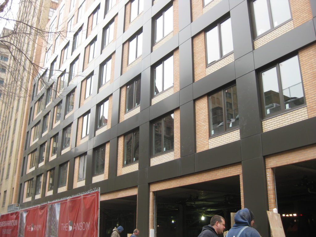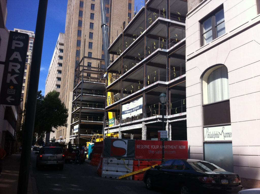 About a year ago, we first gave you a little insight into the interesting history of the 1600 block of Sansom Street. To briefly review, Wayne Spilove, then head of the Historical Commission, purchased the non-high-rise buildings on the north side of the block from Sam Rappaport, and proceeded to demolish them all. His plans for a twelve-story parking garage fell through, and an embarrassing surface lot persisted for many years after. Finally, Pearl Apartments stepped forward last year with plans for The Sansom, which would finally fill in this lot in the heart of Center City. And construction is progressing nicely.