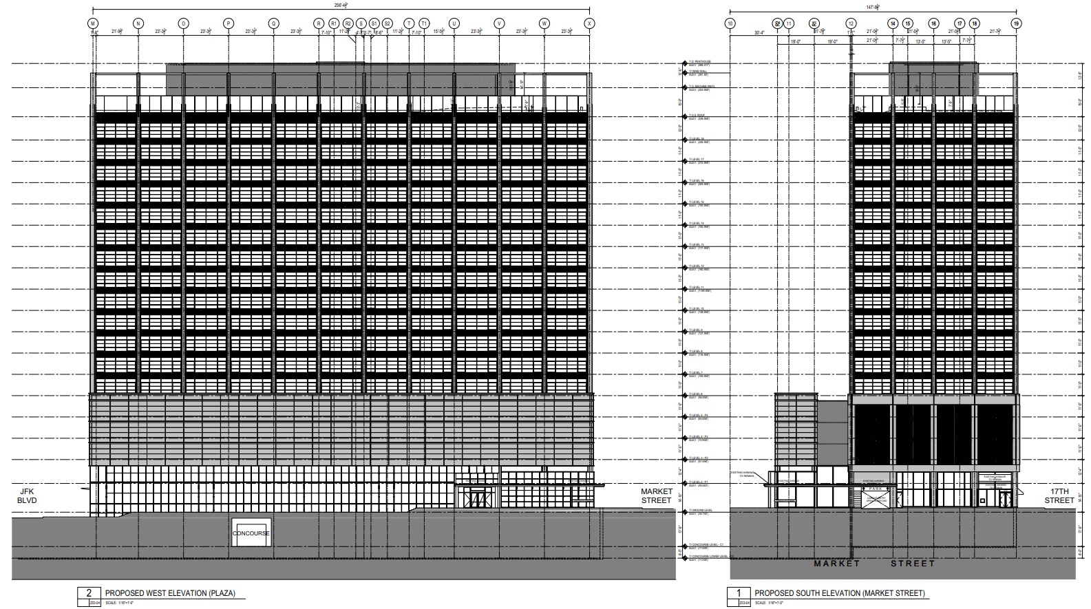The above grade parking will include 189 spaces for cars and zero for bikes, thanks to the grandfathered current parking configuration. The roof deck will also get a major upgrade, with decorative wall treatments, seating spaces, a green roof, a dog run, oh – and an infinity pool looking toward Center City as the crown jewel. From the looks of the elevations drawings, it appears that the facade will get an industrial treatment, but it’s tough to tell much from what we have at the moment.