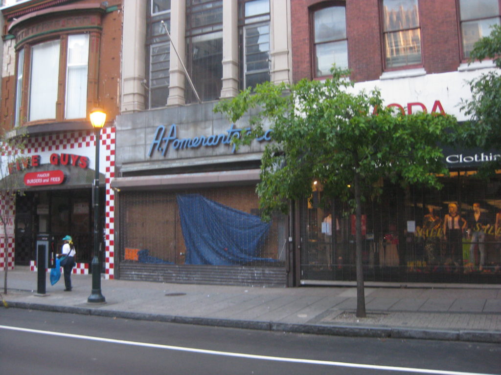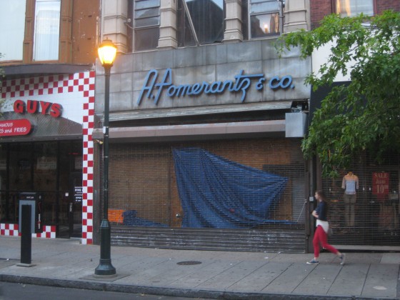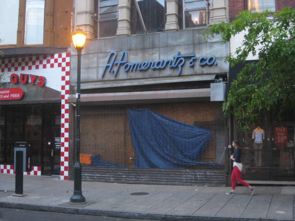 A reader checked in the other day, looking for more info on 1525 Chestnut St., known to many as the A. Pomerantz Building. This building was constructed in 1917, and designed by Simon & Bassett, according to the Preservation Alliance. It was home to an office supply business for decades, and has been one of those buildings we’ve really enjoyed looking at over the years. Its skinny stature (at least compared to surrounding buildings) and its elaborate cornice invite passersby to pause for a moment to drink in the building. And let’s not forget the old sign above the storefront, a relic from a Chestnut Street that’s long gone.