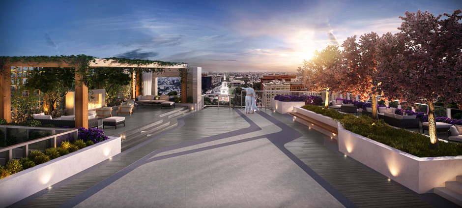 Though the building will rise quite high and join the skyline, it will only contain about three dozen units. According to a story from Philly.com, the smallest units will have about 2,000 sqft of space with an asking price of $3M, full floor units will have about 4,300 sqft of space, and an 8,900 sqft penthouse unit is under agreement at $17.85M. The building will have a baller 86-spot automated underground parking lot, which means that cars will come up quickly and the lot will require no staffing. Other amenities will include a lap pool, a massive terrace, a fitness center, a billiard room, a meeting room with a kitchen, and an on-call town car and driver. And uh, the views are gonna be pretty awesome. Cecil Baker + Partners did the design work, and are responsible for these renderings: