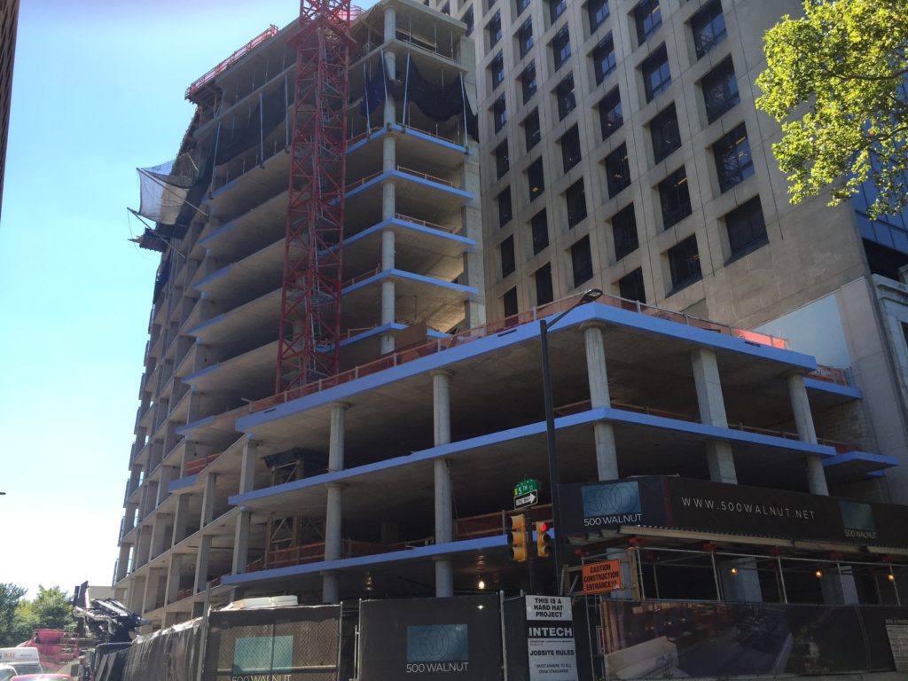 Despite the fact that it's been under construction for over a year, we've somehow never covered 500 Walnut, the new ultra-high-end apartment building at the southwest corner of 5th & Walnut. This parcel was sitting vacant for years, and has several development possibilities come and go before Scannapieco Development Corporation, the company that developed 1706 Rittenhouse Square, stepped forward with the project that's now happening. That project is currently about 12 stories tall but will eventually rise to 26 stories.