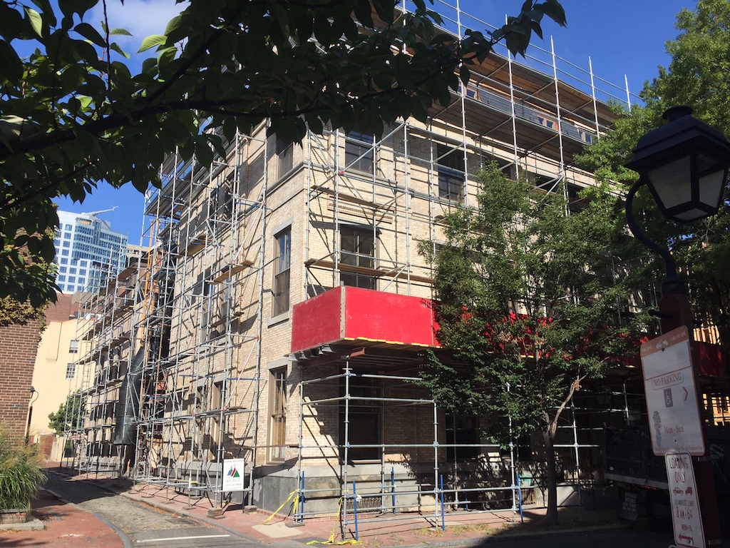 We passed by this property the other day and saw that construction is progressing steadily. The bricks of the apartment building seem to have gotten their first cleaning in decades, revealing a much lighter facade than we could have expected previously. And framing is moving along for the homes to the north.