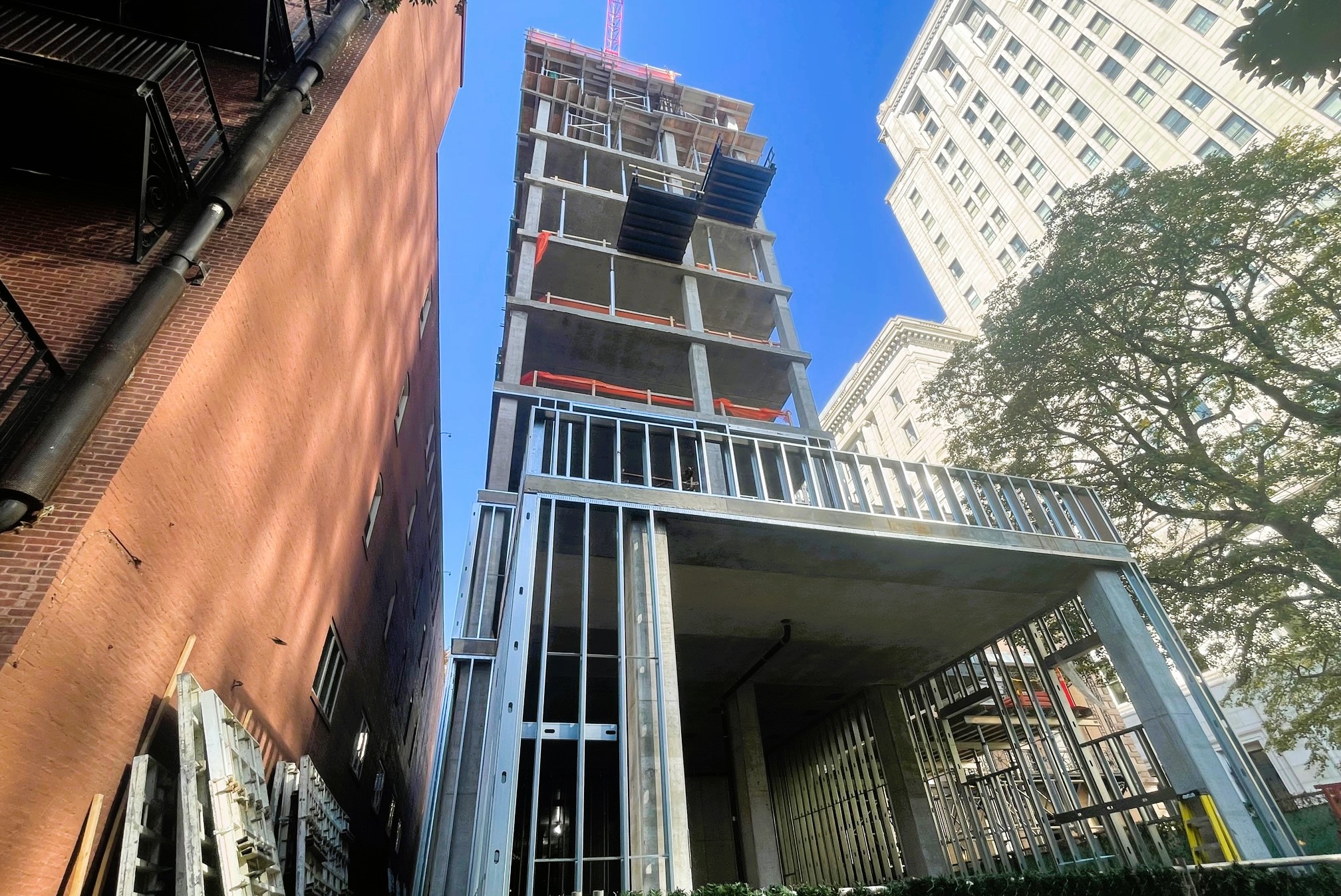 That tower you see hiding behind the trees is the new addition to the Dilworth House, which is bringing ten luxury condos to 223 S. 6th St., behind the historic property. After a long slog in the past to get this project moving forward, Astoban Investments purchased the property and have since gotten this thing out of the ground. We visited this spring when things were still at street level, so we were taken aback by the quick progress on this contemporary addition.