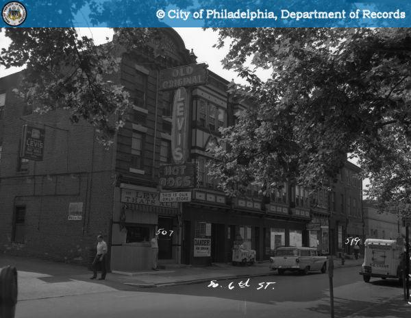 According to the text, the building not only produced wieners and fish cakes but was also the unofficial headquarters for the Republican Party in the fifth ward throughout much of its history. Following WWII, the hot dog stand’s fortunes started to decline slightly. Much of the neighborhood around it began to change, with many of the area’s immigrant families having achieved sufficient comfort to move out to the suburbs. Still, in the midst of this decline, Levis remained a stubborn survivor. It is shown here below in a 1961 image taken from the Philadelphia Department of Records.