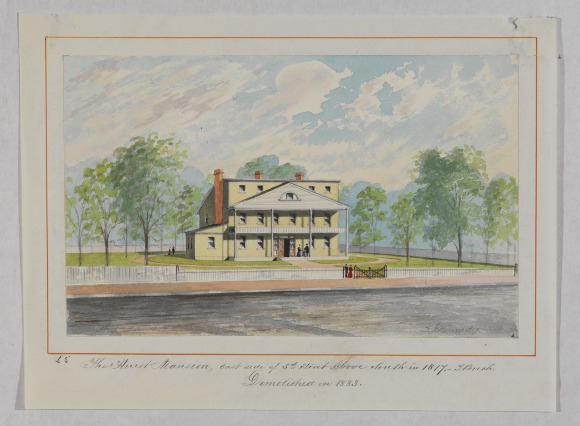 Baron Hurst, as he was also known, possessed a wealth of land in Society Hill during the Revolutionary Era but the Mansion served as his primary residence. The watercolor painting below is taken from the Historical Society of Pennsylvania and shows the estate as it would have appeared in 1817.