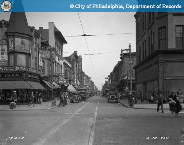The Free Library tells that the mansion would become a tavern for a brief period thereafter, though details on said tavern are scant. According to the Historical Society, the building would be demolished in 1883. In the coming decades, the makeup of South Street would shift dramatically. The swelling immigrant populations brought a new cultural identity to the surrounding neighborhoods, with Jewish, Irish and Italian enclaves producing their own thriving economies. The intersection of 5th and South fell right in the heart of the burgeoning Jewish quarter and its specialized expertise in fabrics, tailoring and dressmaking. By the early 20th century, the area would be renowned for its clothing retail opportunities. The image below, taken from the Philadelphia Department of Records, shows the former location of Hurst Mansion in 1930, where it appears an establishment called Spiegel’s Furs has set up shop.