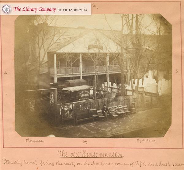 According to The Black Bottom, Southwark would be absorbed by Philadelphia in 1854, at which point Cedar Street would be rechristened as South Street. By this time, the Hurst Mansion had passed out of the hands of its titular family. According to the Free Library of Philadelphia, the once stately mansion was being used as a storage grounds for its occupants at this time. The Free Library notes that the lands directly west of the mansion had been used as burial grounds during the Revolutionary era. As the image from 1858 shows, the front yard of Mansion had become a receptacle for the gravestones from the now defunct cemetery as well as a parking lot for W.B. Chambers’ Grocer wagon.