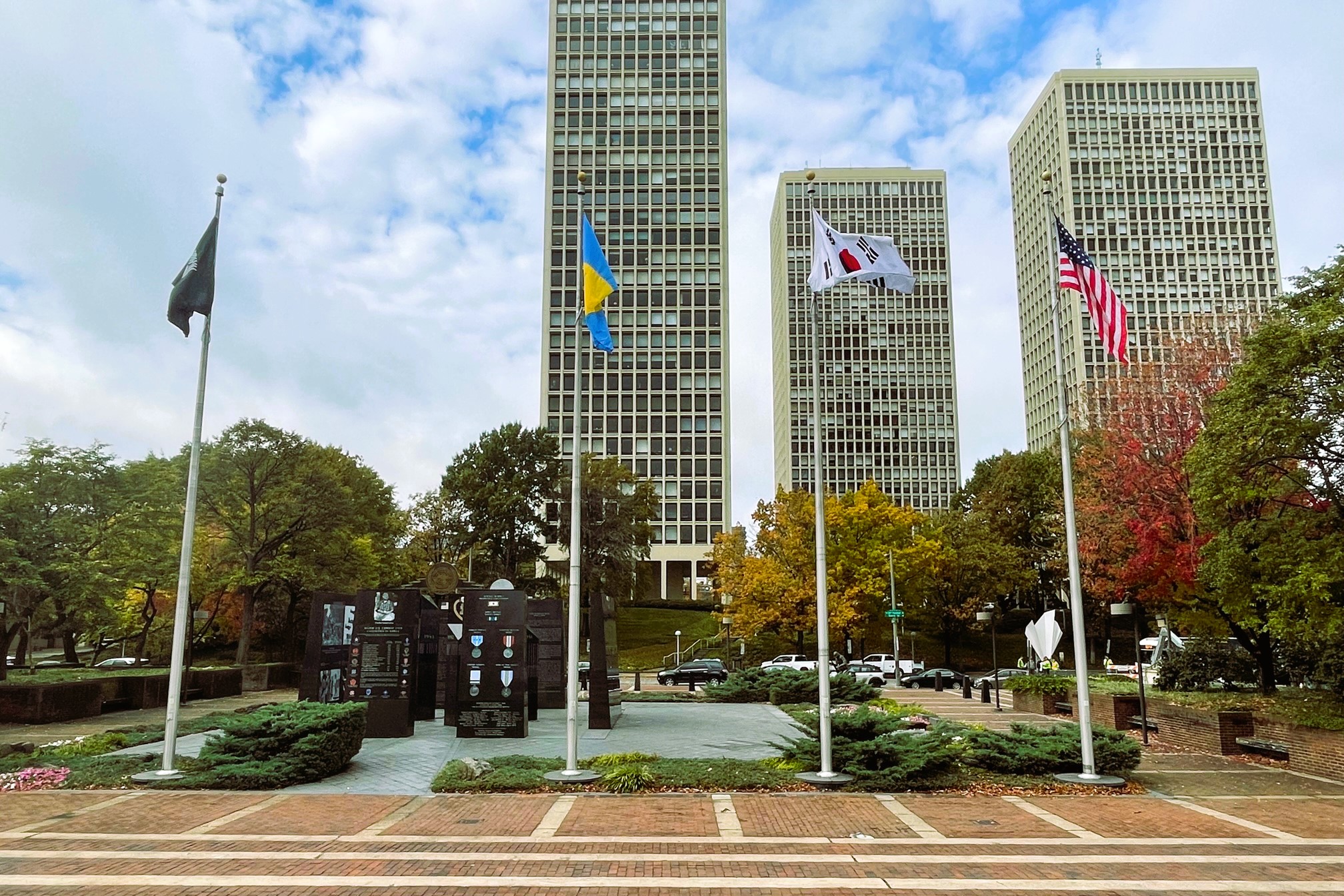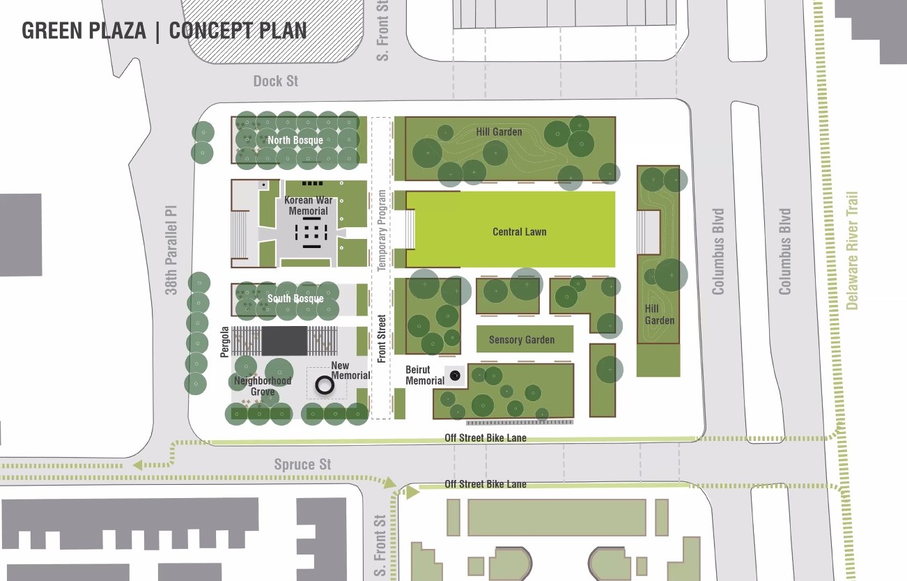 According to OLIN, it quickly became clear that the Green Plaza concept was the best choice for optimizing the existing space while creating a welcoming area for visitors. Some of the key components include a new sensory garden, additional lawns, groves of trees flanking the Korean War Memorial, and a placeholder spot for another possible memorial on the southwest corner. Also exciting is the inclusion of bike paths along the sidewalks on the south end of the site, helping solve the problem of the Belgian block streets which surround the plaza. The bike share station would also be moved to the south end of the site for easy access. Accessibility will be improved from all sides, which will make navigating this area much easier, especially for those with limited mobility.