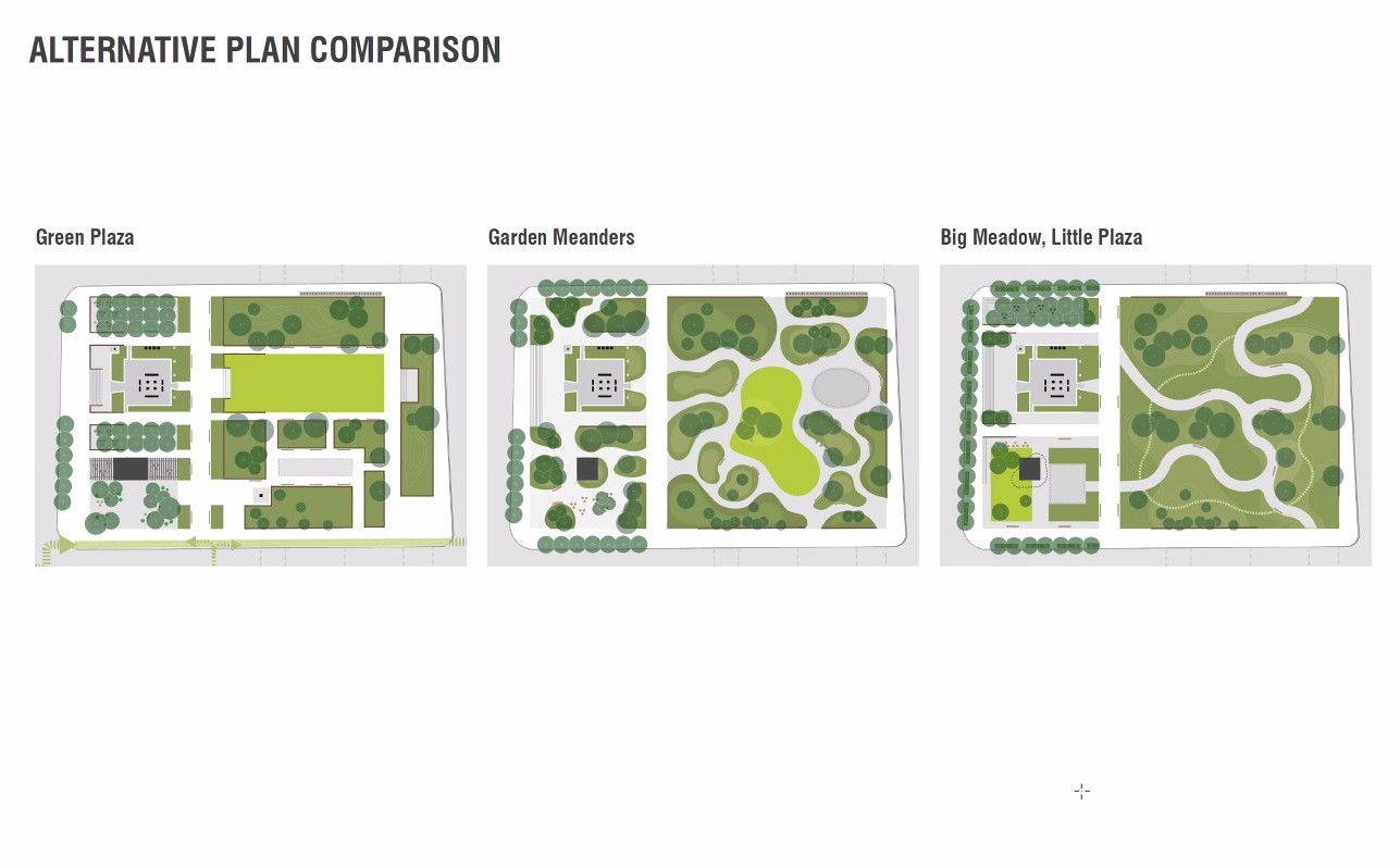 Based on stakeholder and community feedback, a few design elements were considered crucial to the success of the site. An attractive, calm, green space that integrates the neighborhood with the existing memorials and waterfront were the foundational principles for the direction of the plaza. Additionally, there were some slightly more contentious aspects, and thanks to a presentation from lead architects OLIN at a SHCA meeting on March 6th, we now have a better idea of how those features will shake out. Out for the project are any permanent cafe/commercial spaces, a dog park, and a community garden; additional public art and memorials are maybes, given how they may work with the overall plans. As such, OLIN created three designs, which you can see below.