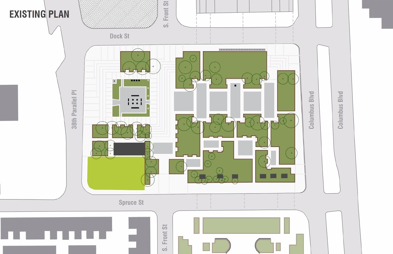Who doesn’t love a good public space? We love the fresh air, trees, plants, activated areas for people to gather and enjoy each other’s company, and/or the chance for some solitude in the city. The issue is, not all public spaces would be considered “good” with this definition. One such place is Foglietta Plaza, at the intersection of Front & Spruce in Society Hill, where beyond two memorials and some mature trees, a multi-tiered brick expanse offers little in the form of relaxation. The “lovely” building on-site that hosts out-of-service bathrooms and mechanical equipment doesn’t exactly add to the mix. This seems like a missed opportunity, as the dusty and inaccessible plaza is in an A+ location, and thankfully, the Society Hill Civic Association agrees.