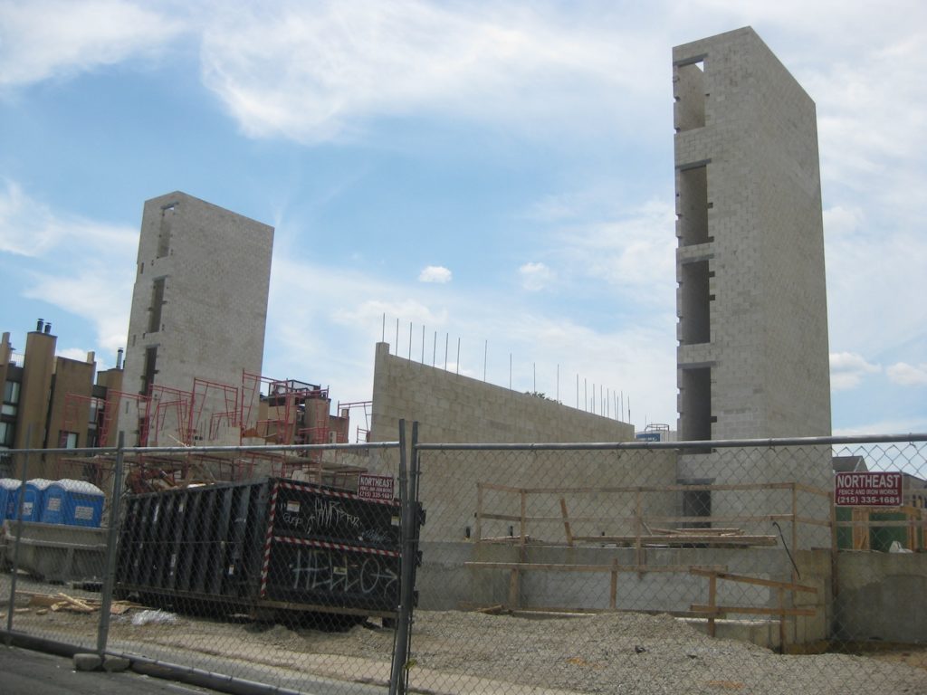 Somehow, it's been a really long time since we've checked in on 410 S. Front St., the long-vacant former Stamper Square/New Market site in Society Hill. Two years back, Toll Brothers had just presented a concrete plan to the community for a four-story condo building with underground parking. As the time has passed, some project details like the number of units and number of parking spots have changed some, but the overall project remains pretty much the same. Passing by maybe a week ago, we spied what we're pretty sure are elevator towers under construction and a ton of work happening below grade.