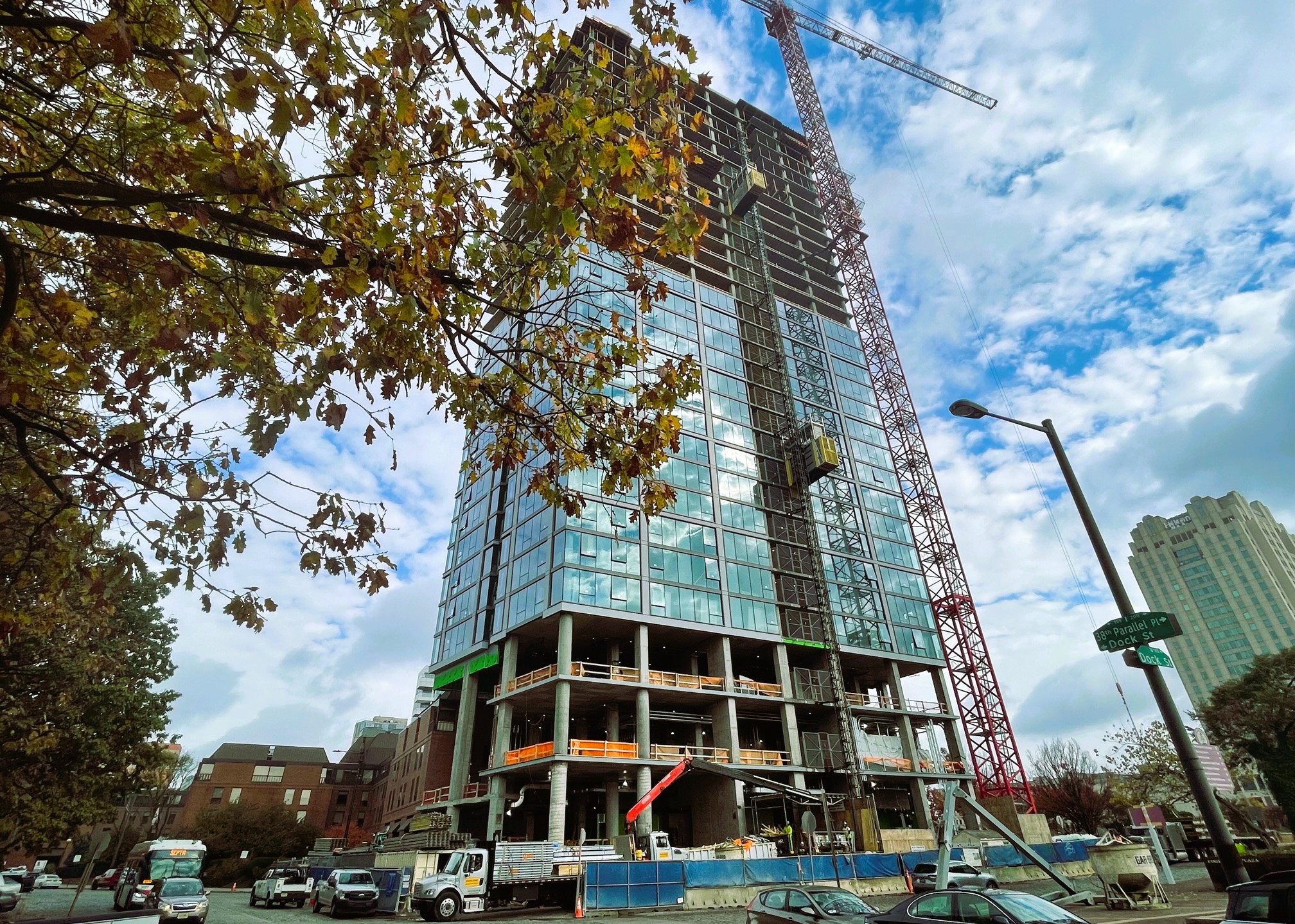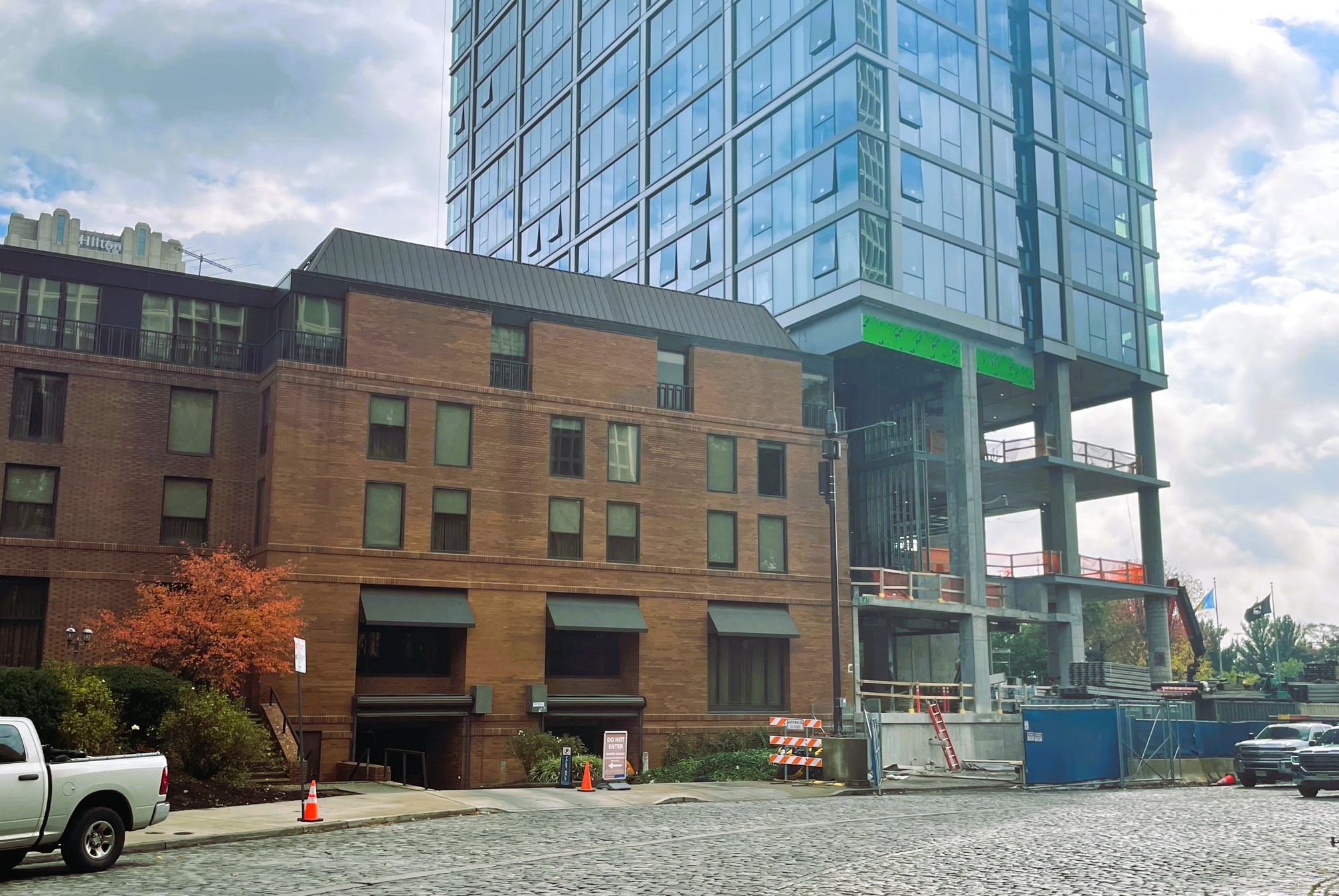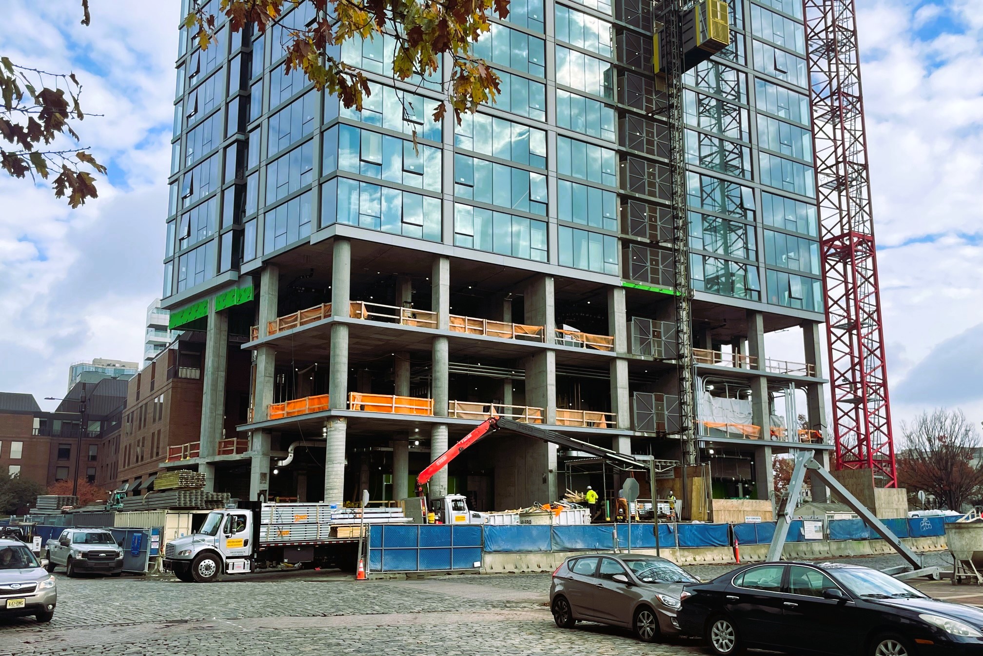 Society Hill is an area of the city that has remained remarkably stubborn in the face of the recent wave of development that has taken to just about every corner of the city. A lack of large development parcels combined with a push to limit height has led to few projects at the scale we’re seeing in most neighborhoods in or near Center City. However, one notable exception is getting close to its apex at 1 Dock Street, where a modern tower is taking its place along the Belgian block boulevard.