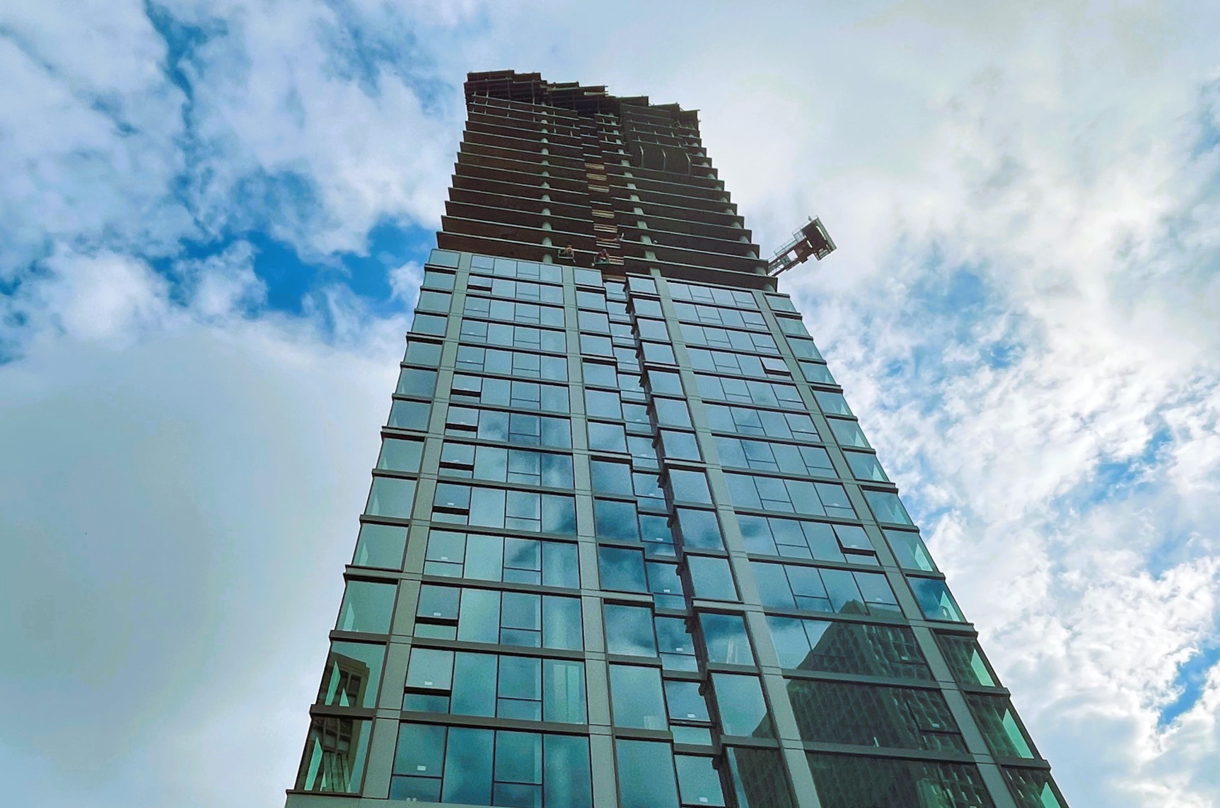 The main structure is nearing the top, with the final setback looking close to starting. The ground-level is still very much a construction site, though the upper floors are looking sharp, with glass creeping up near the halfway point. While not a wild massing in any regard, the slight angle of the western facade gives the structure much more interest than the rectangular volume might initially suggest from afar. The top portion of the building will feature balconies, which will further break up the bluish glass here, which is ever-present across the city.