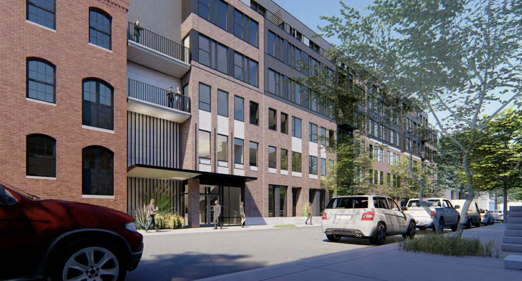 A quick history: the property was built back in the 1870s as a decorating plant for the Franklin Flint Glass Works of Gillinder & Sons, and we provided much more info when we covered a proposal here back in 2020. These plans from Urban Conversions and CosicaMoos Architecture proposed to remove a chunk of the decrepit factory complex, replacing it with a modern six-story addition, bringing 103 units and a couple of retail spots. At the time we noted that there were still a couple of steps remaining before this became a reality, but a recent visit to the site shows that things have indeed charged forward. Let’s check out the site over the years and see how it looks today.