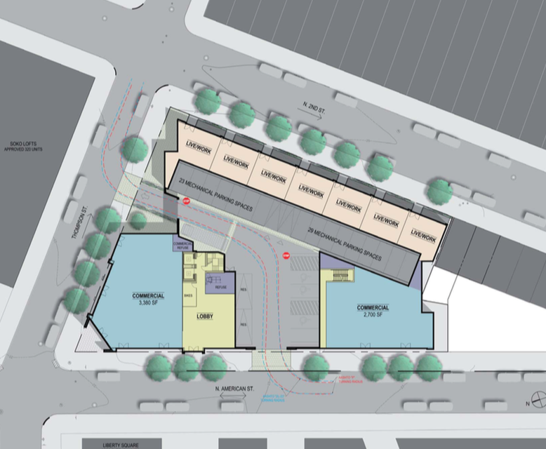 That faint buzzing you hear is the background might just be the sound of development in South Kensington. Or maybe it's a lightbulb that needs to be replaced? But assuming it's the former, let's consider that this neighborhood has seen tremendous growth in recent years, with projects big and small dotting the landscape. New developers stepped in to buy the Soko Lofts project at the end of last year, and we imagine that project will start moving forward soon. On the west side of the 1200 block of N. 5th Street, a 29-unit project recently broke ground. And now Blackstone Development has another project planned for this neighborhood at 1222 N. 2nd St., in between the Soko Lofts and their upcoming Liberty Square project.