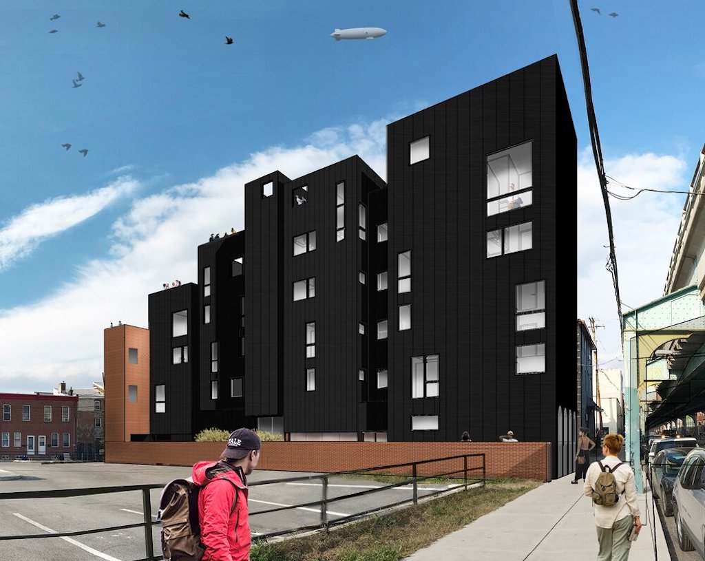 The combined parcels cover over 4,000 sqft of space, which is a nice amount of land for an apartment building. Last summer, the developers got a variance from the ZBA to consolidate some of the lots and build just that. Plans call for a five-story building with retail on the first floor and 15 apartments on the upper floors. Bright Common did the design work, working with artist Carla Weeks on the facade. The result is something we’ve never seen before. Notice how the arches in the facade are modeled after the arches of the Wm. Mulherin’s Sons building across the street and how the concrete and steel structure of the El will be similarly echoed in architectural details on the facade. The southern and western facades will be more standard.