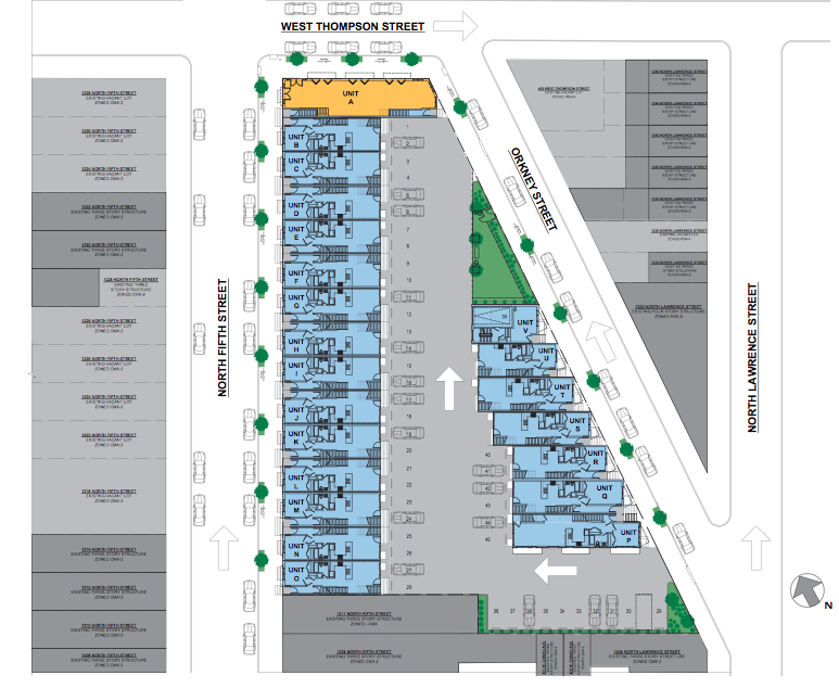 But it just so happens, we've seen the plans, thanks to the good people at Harman Deutsch. And they do indeed make for a fine improvement over what we see today. The project will entail 14 duplexes on 5th Street, 7 duplexes on Orkney Street, a mixed-use building at the corner of 5th & Thompson, and a dog park. The site plan also shows 45 parking spaces for the 45 units that will be created.