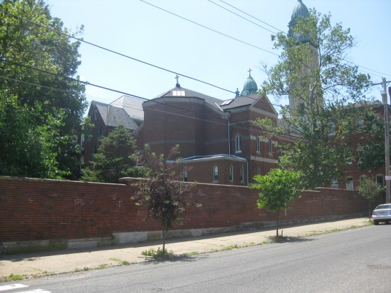 Directly across the street is the rear of Saint Michael’s Rectory, which fronts 2nd Street. Behind the brick wall you see above is a cemetery. On a less scary note for children who might eventually reside here, a ball field is located on the opposite corner.