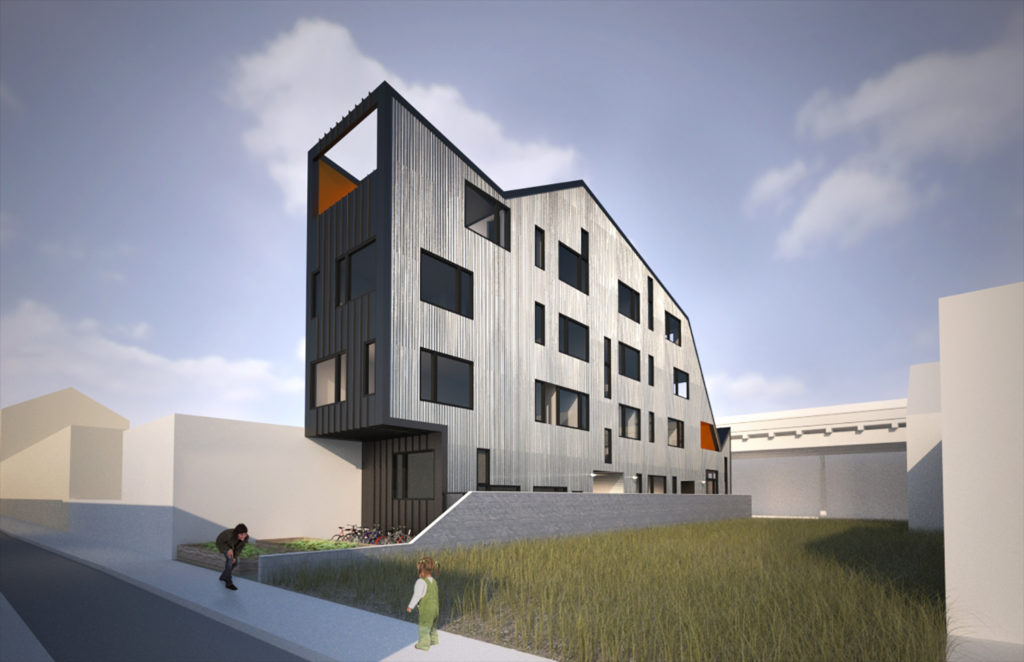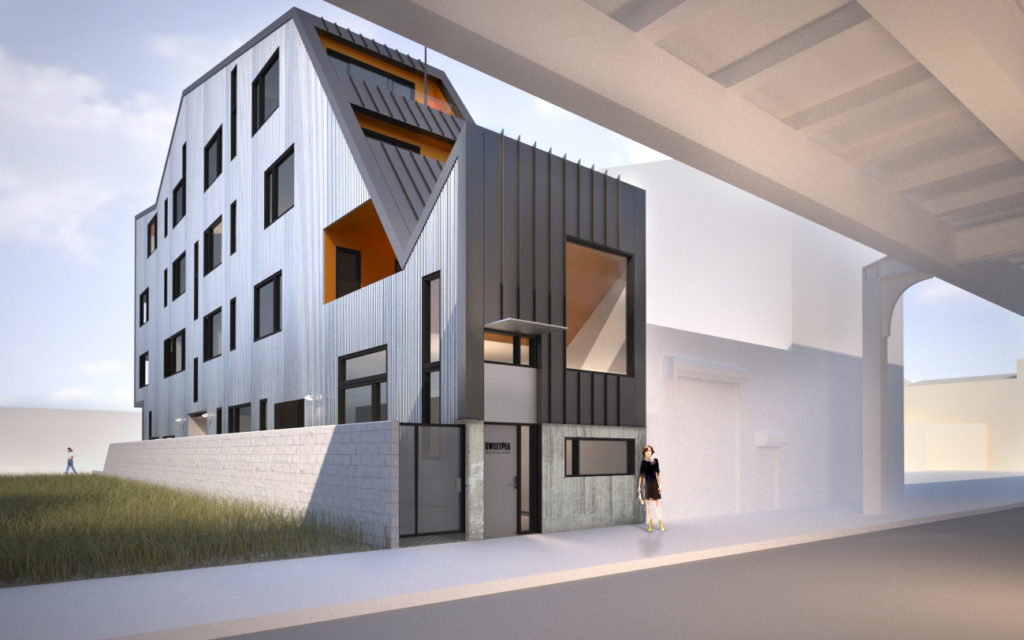 The building, which is being built on the site of a surface parking lot, has the profile of a ski slope or a lousy roller coaster. According to permits, it will ultimately contain six apartments and a retail space on Front Street. We got our mitts on some renderings from Interface Studio Architects, and you can see just how cool this building is gonna look when it's finished.