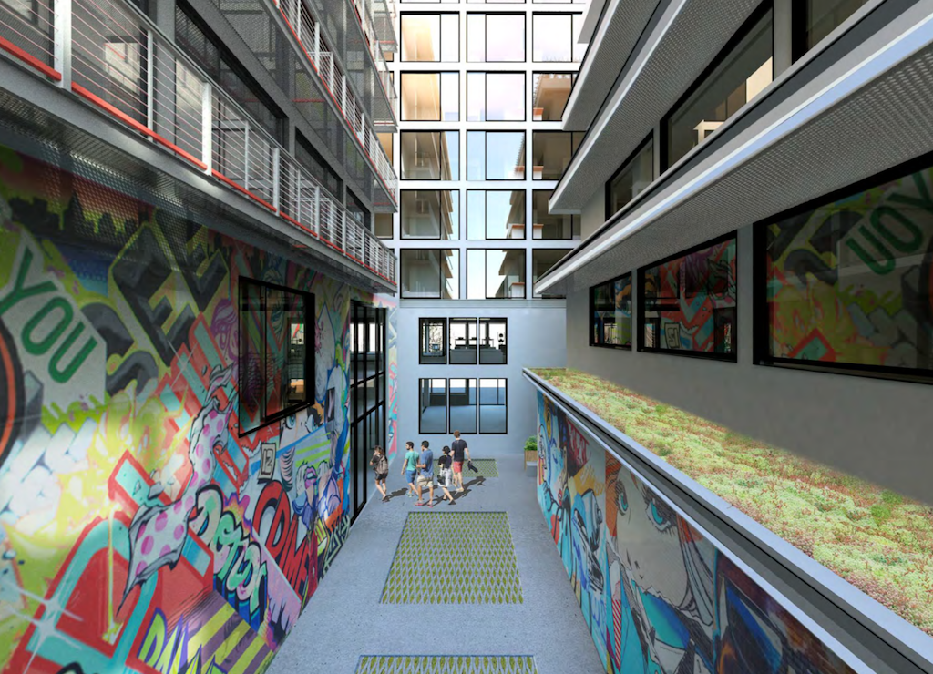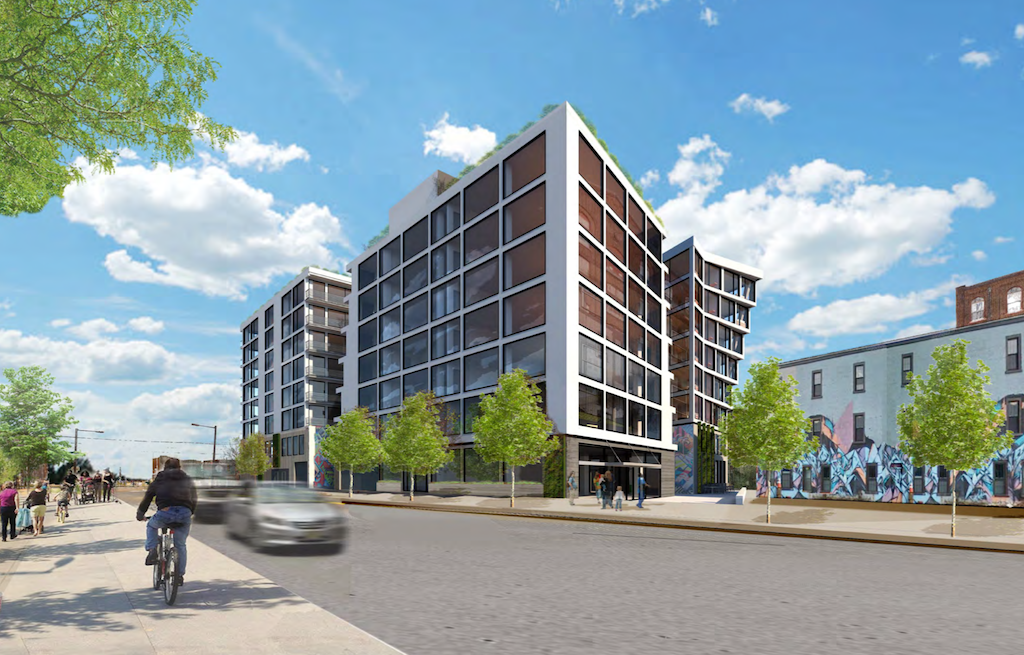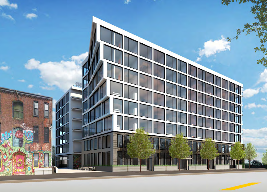 As we told you previously, Flow Development now owns this property. When we covered the property in the past, we didn’t have a perfect grasp on what the developers were planned for the site. Now, thanks to the magic of Civic Design Review, we have a pretty good idea of what’s to come. The developers presented their plans earlier this month at CDR, and now we know to expect an L-shaped building at the corner of 5th & Cecil B Moore, with underground parking, ground-floor retail, 2nd floor office space and “research and development,” and 138 apartments on floors 3-8. On Germantown, the developers are planning another building with retail on the first floor and six stories of office space. Check out the renderings, which also show new space for street art on the walls of the courtyard between the new buildings.