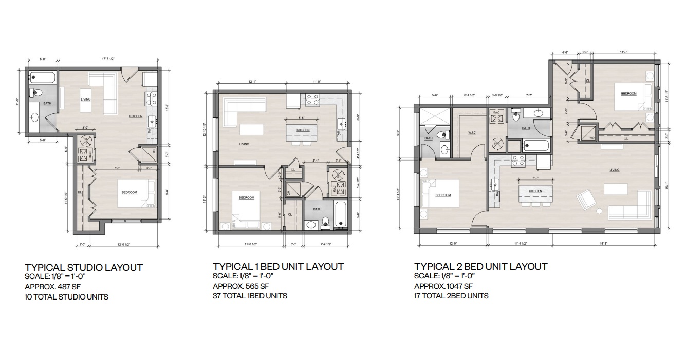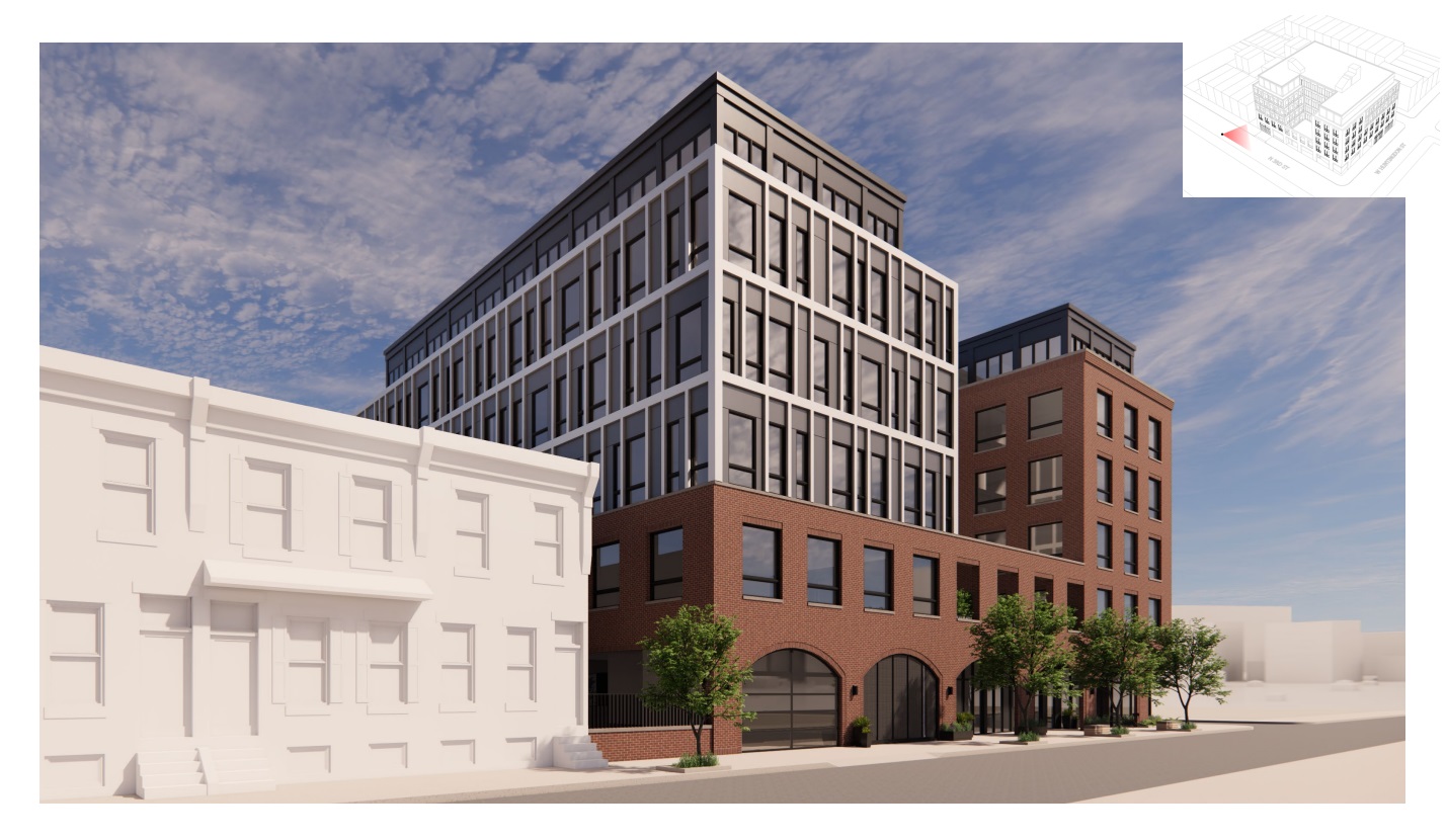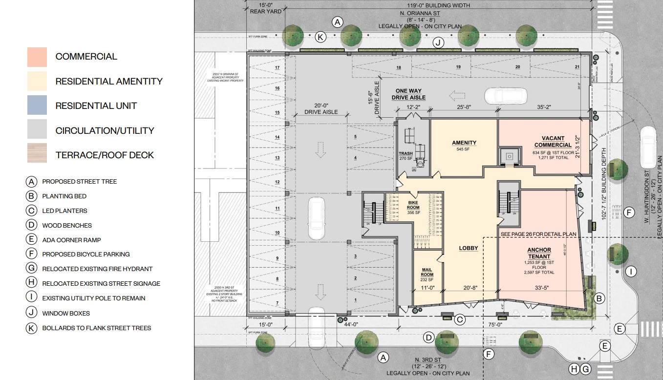 As we have seen time and time again, this part of the city is moving further and further away from its industrial heritage as residential development leads to more properties changing hands. In this case, Orange Peel Properties has big plans for the industrial lot, demolishing the current structure to make way for a 64-unit, mixed-use development designed by Gnome Architects that will soon be making its way to the non-binding Civic Design Review. This project will include two commercial spaces, one at the corner of 3rd & Huntingdon and the other along Huntingdon, both of which will be bi-level. Parking access for 21 car spaces will be from Huntingdon, with the one-way traffic flow taking cars out on the 3rd St. side. The unit mix will be mostly one-bedroom units, with some two-bedroom units and a smattering of studios to round out the plans.