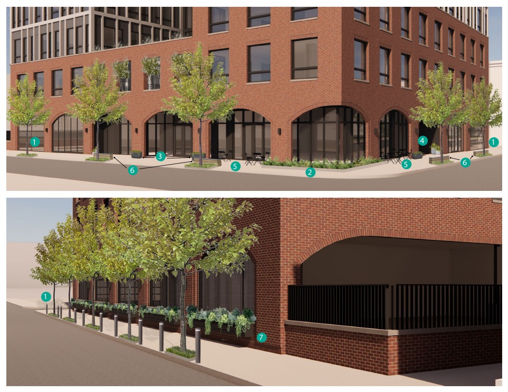 Red brick makes up most of the six-story height, supplemented by paneling in different grays on the other exteriors. The most prominent design feature is the U-shape of the building, which is somewhat mimicked in the arched window openings on the ground level. There are shared outdoor spaces on the 2nd and 6th floors, with the 6th floor units providing private outdoor space for those looking for something a bit cozier. The brick steps down to two and three floors tall as it meets the neighboring buildings, creating a look that blends in nicely while still rising much taller.
