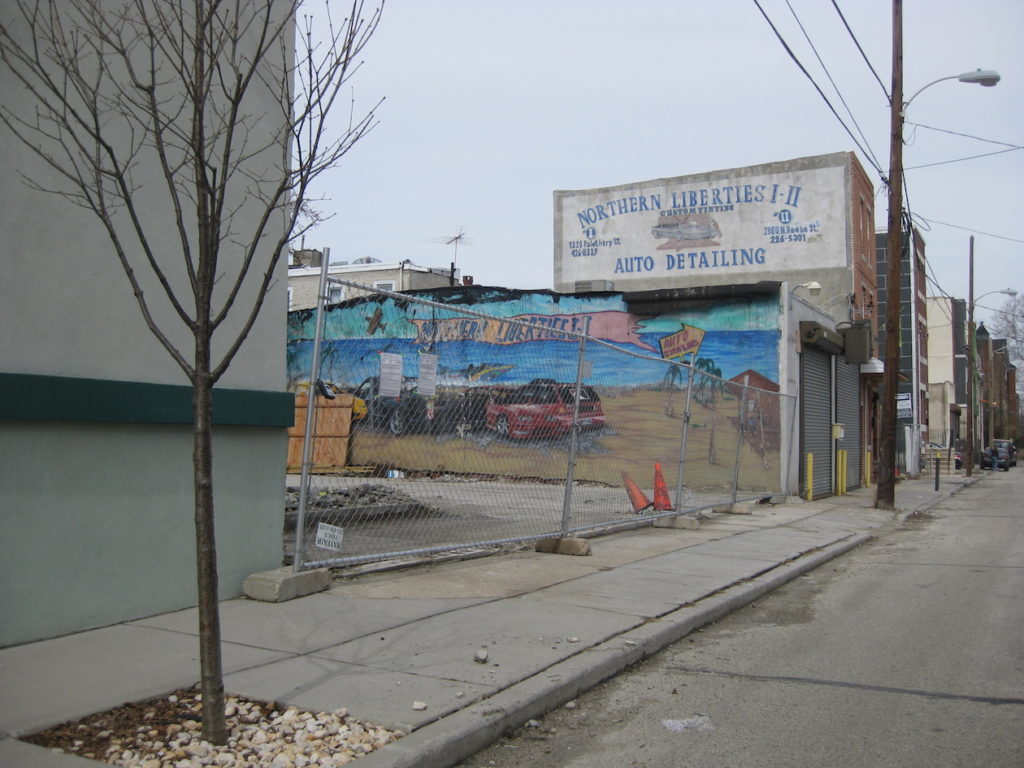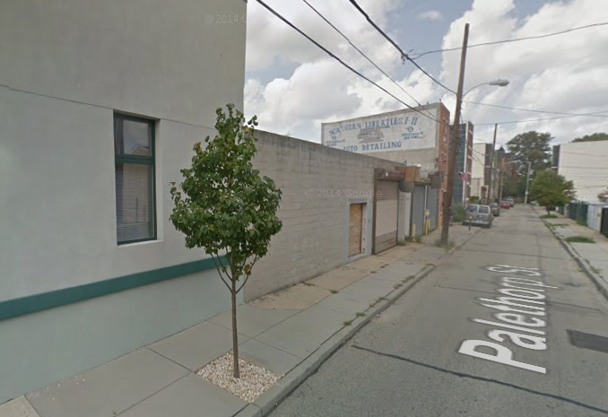 As you can see, at 1314-16 N. Palethorp St., a cinderblock wall and an old garage have been demolished. Keystone Group LLC bought the properties about a year ago, and looking at an old listing it looks like the southern parcel was previously home to a swimming pool. Interestingly, as you can see in the second photo (and as a reader was kind enough to tell us about), the demolition has revealed what looks like a sign for the auto detailing place that may or may not still be in operation next door. Not as cool as a swimming pool, but still.