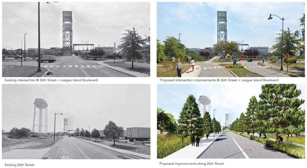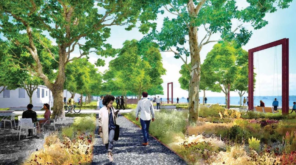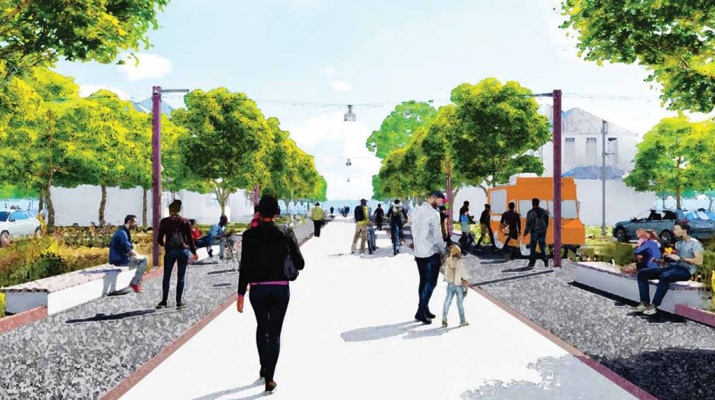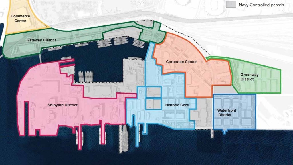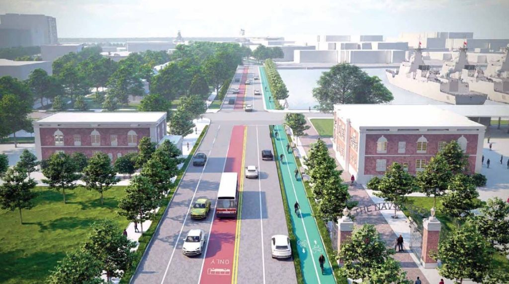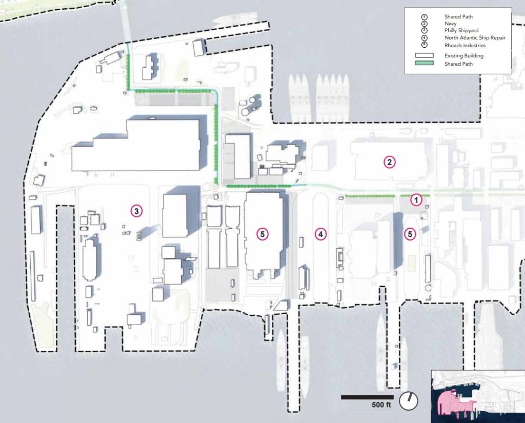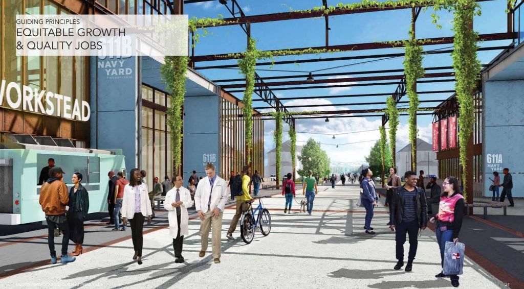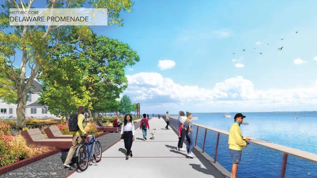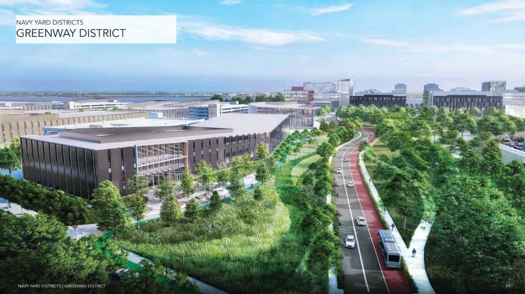 The Shipyard District, which makes up most of the southwest quadrant, is the area most tied to the Navy Yard’s industrial past. This district will stay mostly the same, with the U.S. Navy among others who will continue to use this site for heavy industry and shipbuilding. Infrastructure improvements are the main focus for this district, though a shared-use path will allow for greater pedestrian and bike access for the thousands of people who work here.
