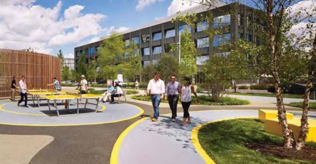 A major office corridor emerged in what is now dubbed the Corporate Center. Featuring modern architecture to form a striking contrast with the historic and industrial buildings on-site, this district embodies the spirit of all of the amazing breakthroughs taking place here. Many companies have set up office, research and manufacturing space in this central district, boosting the street life during the work week. The modern office structures are complemented by ample outdoor space, including the Central Green Park at the heart of this commercial-focused district.