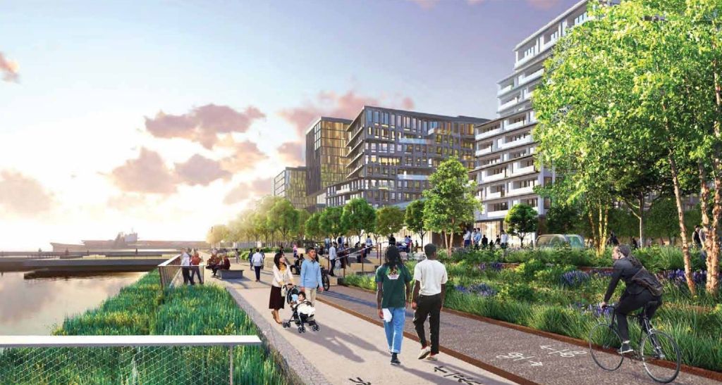 We start our journey with the Gateway District. This area at the north end of the site will act as a new entry point to the Navy Yard, creating a more pleasant and functional path for those visiting in addition to the heavy industry that makes up part of the site. The addition of multi-modal transportation infrastructure will make this a safer and more appealing gateway for everyone, no matter their preferred mode. A waterfront path is also in the works for this section of the site.