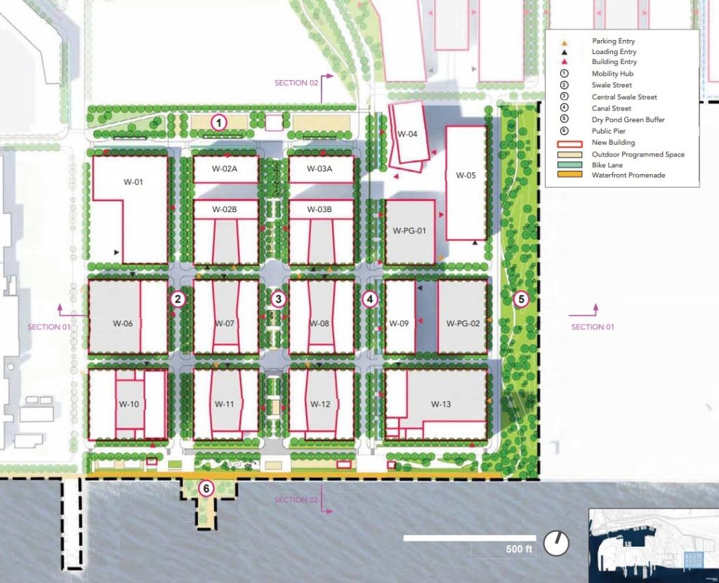 In perhaps the biggest change from the previous designs, the Waterfront District will serve as the residential hub for the Navy Yard. This area will feature dense, mixed-use buildings with thousands of units. A street grid will add to the urban feel, though these streets are quite a bit different to what we normally see in the city. The swale and canal streets will add a very cool feel to the area while also serving ground and storm water management functions. These will help guide residents down to the river, which will be activated with additional walking paths along the waterfront.