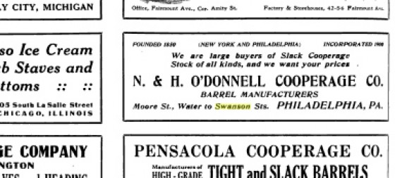 The barrel factory was founded by brothers Neil and Hugh O’Donnell, who according to the 1904 text The Packages, Vol. 7, “were among the largest handlers of slack cooperage stock in the country and are remembered by the trade with respect.” Though the brothers O’Donnell passed on in 1902 and 1904, a trade publication advertisement taken from the June 1912 issue of National Cooper’s Journal, shows the factory occupying the Moore St. side of the building.