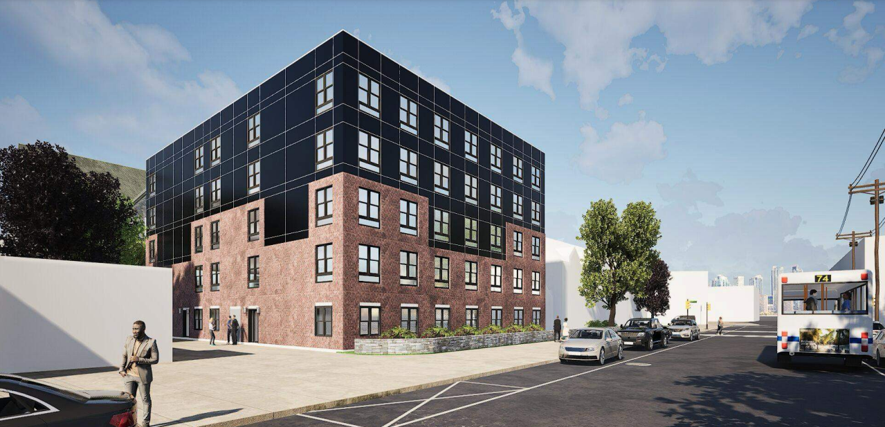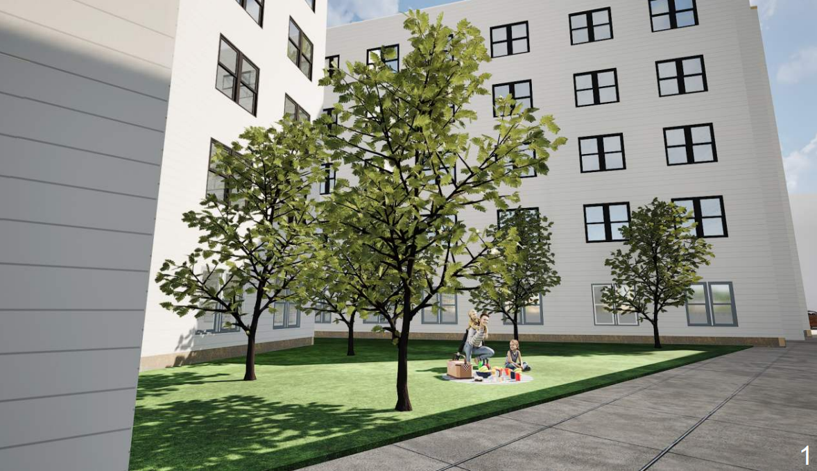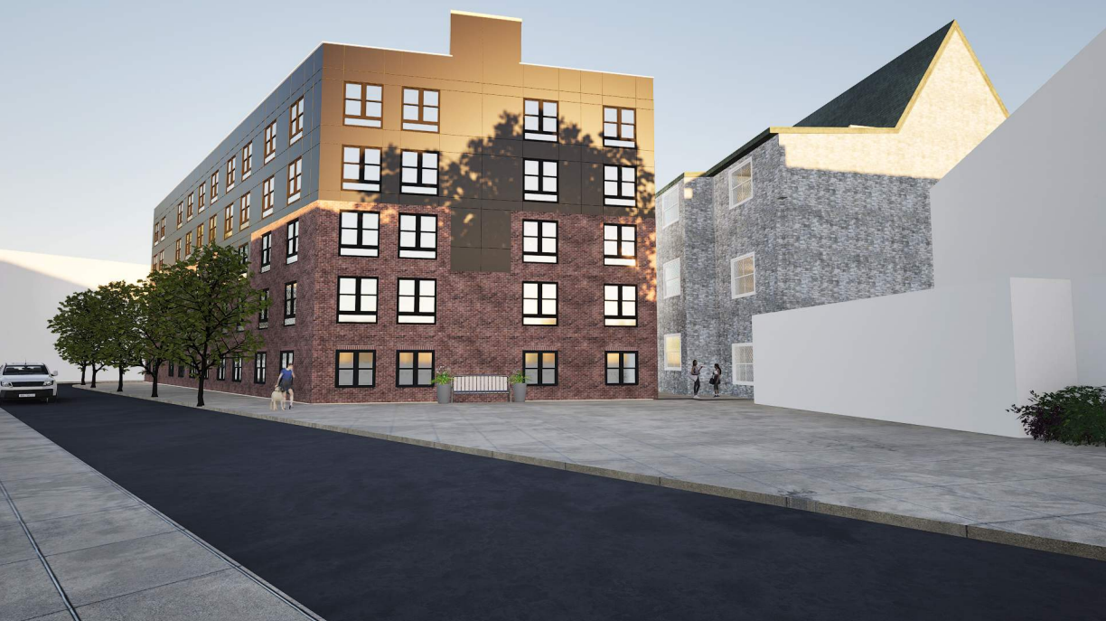 Considering the unusual shape of the property, its limited street frontage, and the existing building right in the middle, we give full marks to the developer for his creative approach. The plans call for the construction of a five-story building on Chester Avenue with 44 units and another 81 units in a five story building in the deepest corner of the combined lot, currently used for surface parking. Finally, look for 35 units in the former school building, in between the new structures. Check out the renderings from WisdomTree Group: