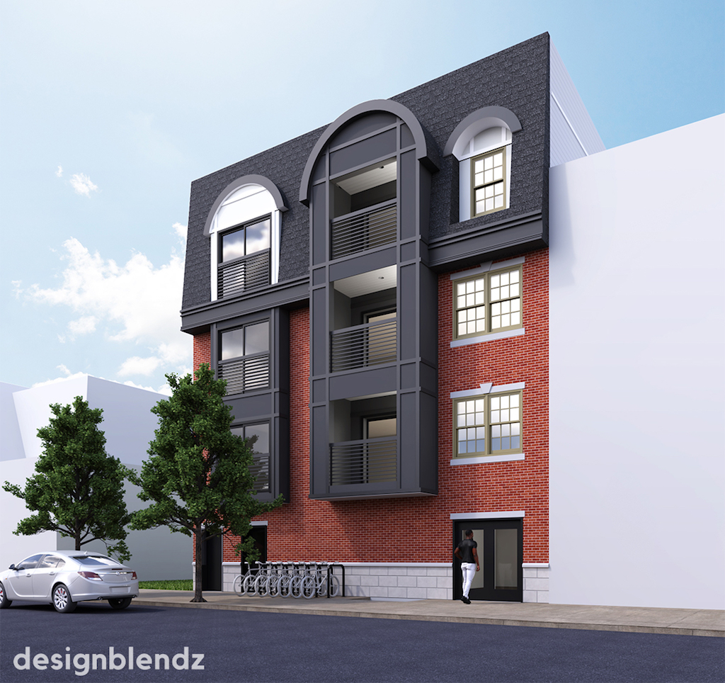 The property holds a tremendous amount of development potential due to its size. You can see, there’s a side yard associated with this property which is currently vacant, and the total lot size is roughly 5,500 sqft. For some reason, the property is zoned CMX-2, which requires ground-floor commercial and allows apartments above. Based on the square footage of the lot, one could build 10 units above commercial here. Using a mixed-income bonus, the owners are instead proposing a 15-unit building, with ground-floor retail. They’re working with Designblendz on the project, and we were able to get our mitts on a rendering.