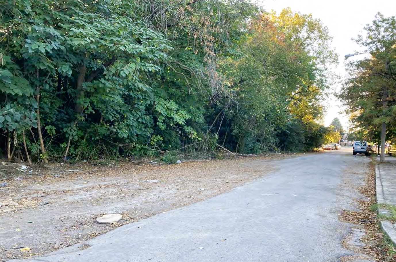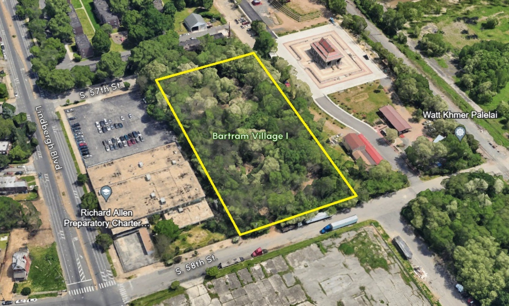 Now, thanks to a submission for an upcoming Civic Design Review meeting, we have the first tangible info on what’s in store. Let’s first check out the property at 2639 S. 58th St., which sits off Lindbergh Blvd. as an overgrown brownfield site that reaches from 57th to 58th. As you can see from ground level, this parcel isn’t exactly teeming with excitement currently (even if there is plenty of foliage).