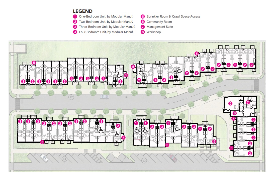 But that parcel will have a very different future soon enough, with 64 units coming to the site across five buildings. Two new roads will be included, one cutting through the middle of the site, and one towards the riverside, along with 36 parking spaces. One of the buildings will also include a community room, a management office, and a workshop space, presumably for residents. These buildings will utilize modular construction and will rise only two stories for the most part, with small areas on the corners rising a third story. A mix of one- through four-bedroom units will be available, allowing for larger families and multiple generations to cohabitate under one roof.