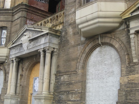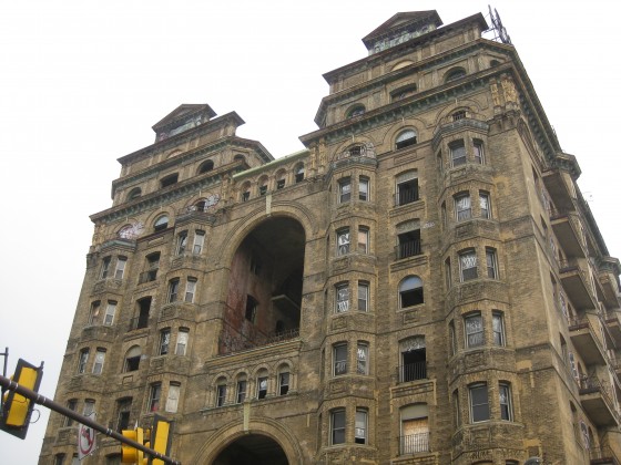 It was constructed in the last decade of the 19th century, and designed by architect Willis G. Hale (a favorite of GroJLart) in the Victorian style. Originally used as apartments for rich folks, it became a classy hotel within a decade and remained as such until 1948. That year, when it was purchased by Father Divine, it shed its aristocratic air and welcomed guests of all income levels, races, and creeds. It was, notably, one of the first racially integrated hotels in the country. Father Divine opened a soup kitchen on the first floor of the building, and a house of worship in a former banquet hall on the tenth floor. In 2000, Father Divine’s congregation sold the building, and it’s been sold twice since then, most recently in 2006.