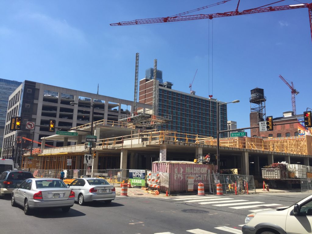 Parkway is no stranger to North Broad Street, with their headquarters a few blocks to the south and its involvement in two major projects nearby at Broad & Callowhill. The last time we checked in on those projects, about half a year ago, they were in the early stages of construction. While the building on the west side of Broad is now only one story up, the building on the east side has progressed considerably. Remember, the western building will rise six stories and will include 229 apartments, two retail spaces, and 256 parking spots. The smaller building on the east side will also be six stories tall and have two retail spaces, but it will only have 110 apartments and 114 parking spots.
