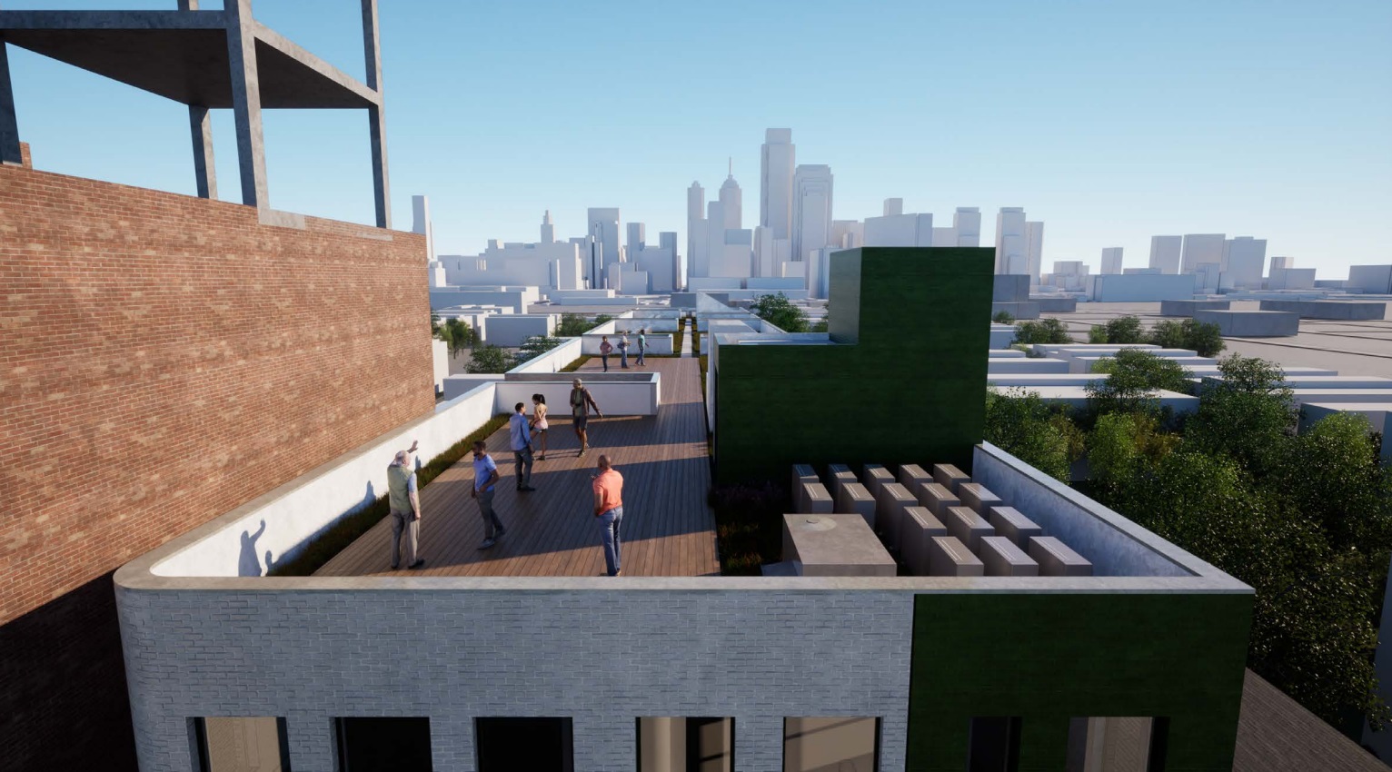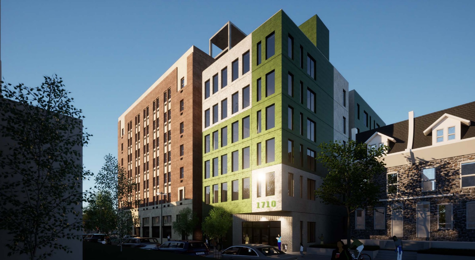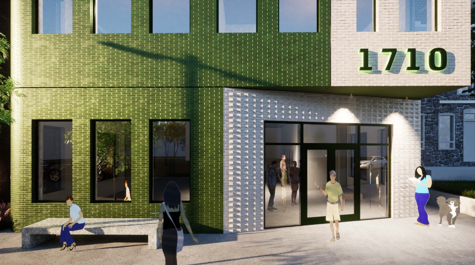 The design from Oombra Architects is not what we would have expected here. The building utilizes bright green and white brick for the entirety of its facade, with the window scale and placement mimicking the tower next door (which sits very close to said windows). The rounded front corner adds a playfulness to what could otherwise be a heavy design, and a large roof deck will offer up views of Center City – even if the rendered skyline is a bit out of date. The units will also utilize a space-saving system to mitigate some of the impact of their small dimensions, which will be in the 400-500 sqft range.